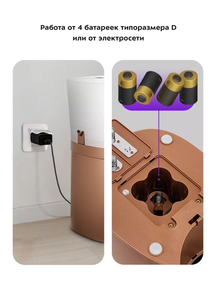 Прибор работает от трех батареек типоразмера D (не входят в комплект). Это позволяет использовать умную кормушку в любом удобном для вас месте. Также вы можете подключить умную кормушку к электросети с помощью USB-шнура и блока питания с выходными параметрами =5 В, 1 А (входят в комплект). Если батарейки будут установлены в устройство, при отсутствии напряжения в электросети умная кормушка автоматически продолжит работу от батареек как от резервного питания.