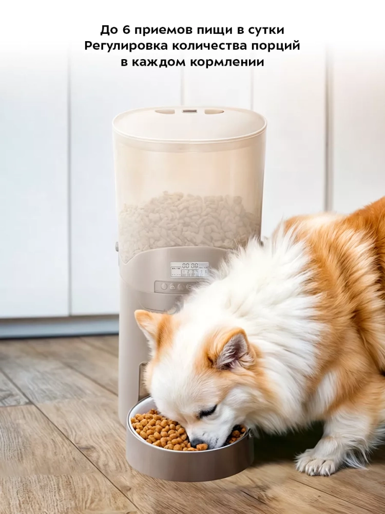 Умная кормушка предназначена для выдачи только сухого корма с фракцией 5–12 мм. Резервуар для корма емкостью 6 л обеспечит питомца кормом на 2–3 недели в зависимости от количества порций. Примерный объем единичной порции составляет 5–8 г. Вы можете настроить выдачу до 48 единичных порций в каждом кормлении. Миска из нержавеющей стали рассчитана на 400 мл.
