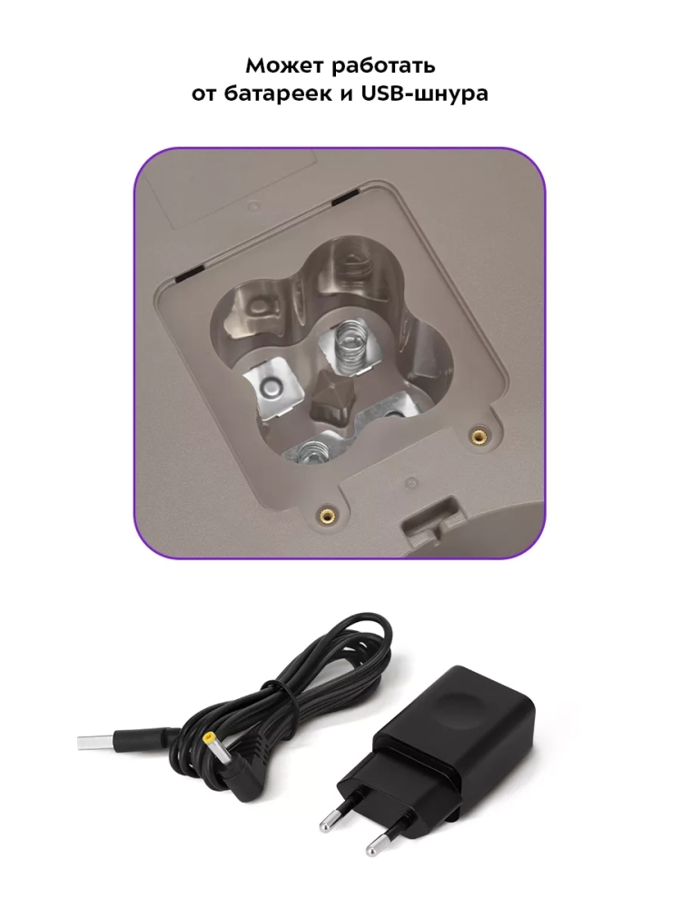 Прибор работает от четырех батареек типоразмера D (не входят в комплект). Это позволяет использовать умную кормушку в любом удобном для вас месте. Также вы можете подключить умную кормушку к электросети с помощью USB-шнура и блока питания с выходными параметрами =5 В, 1 А (входят в комплект). Если батарейки будут установлены в устройство, при отсутствии напряжения в электросети умная кормушка автоматически продолжит работу от батареек как от резервного питания.