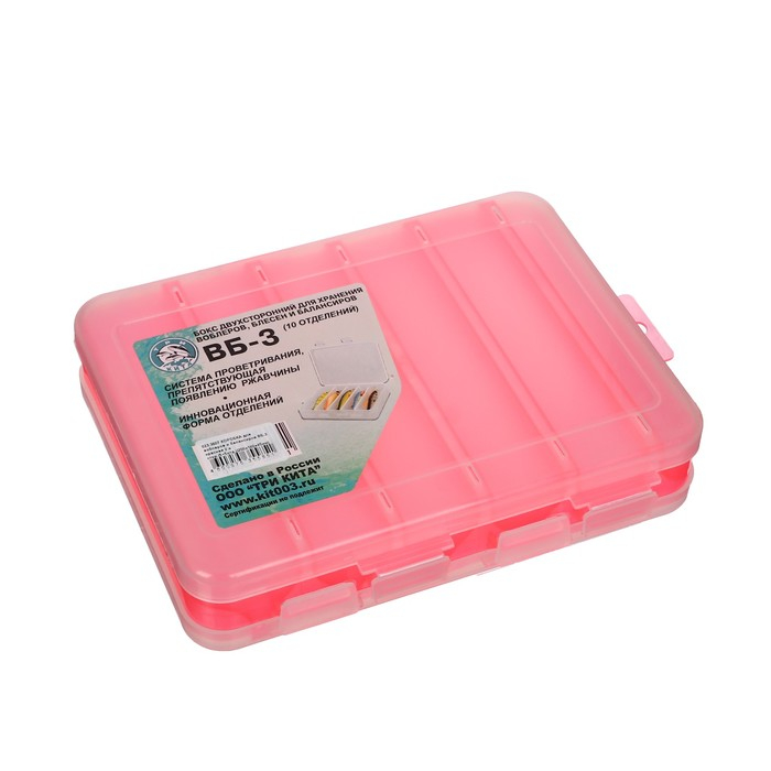 Коробка изготовлена из высококачественного пластика, двусторонняя, по 5 отсеков с обеих сторон. Может использоваться не только для хранения воблеров, но и балансиров, транспортировки блесен. На крышке бокса предусмотрены отверстия для вентиляции, которые избавляют от излишней влаги и снижают риск появления ржавчины металлических частей рыболовных принадлежностей.