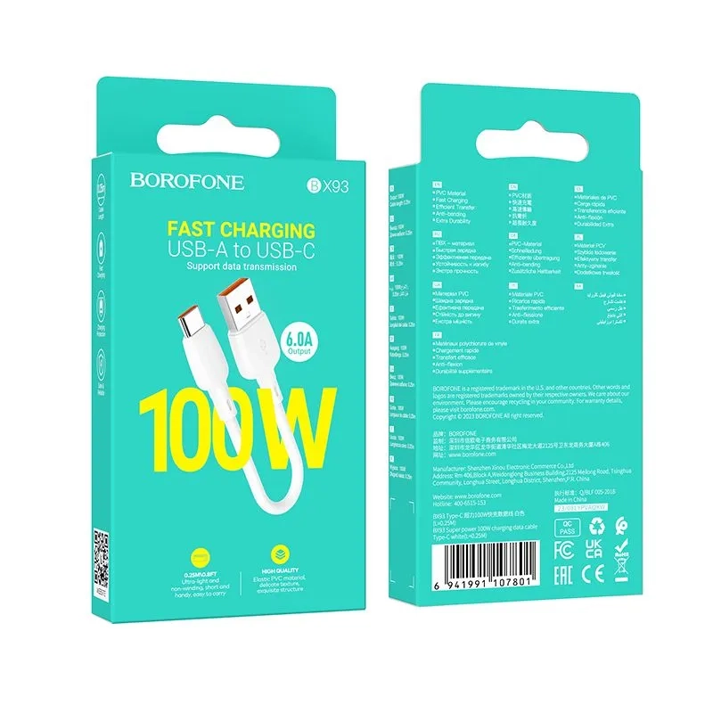 (короткий USB‑C кабель 25 см; 100 Вт кабель; BOROFONE BX93; USB‑C кабель 6 A; прочный кабель PVC; кабель для ноутбука и смартфона; универсальный USB‑C кабель)