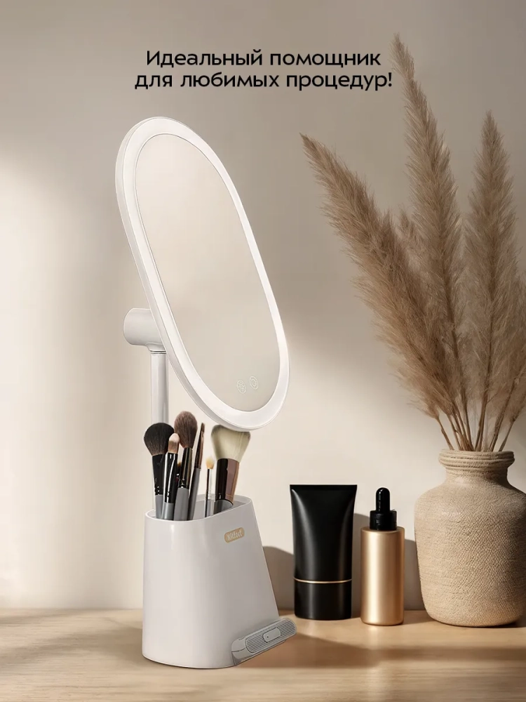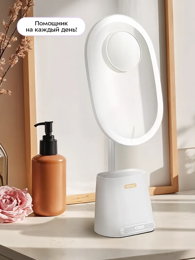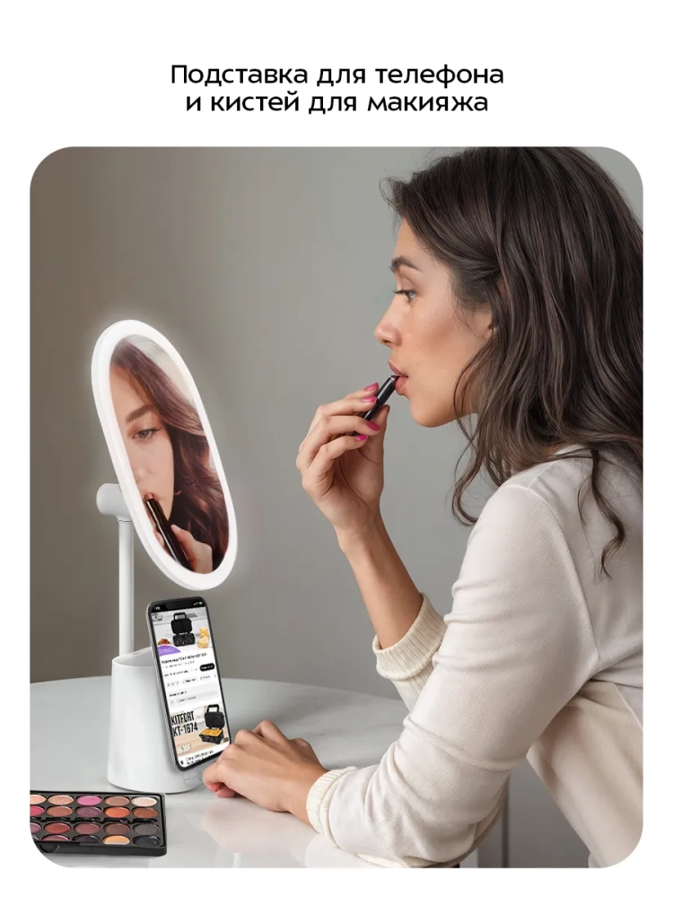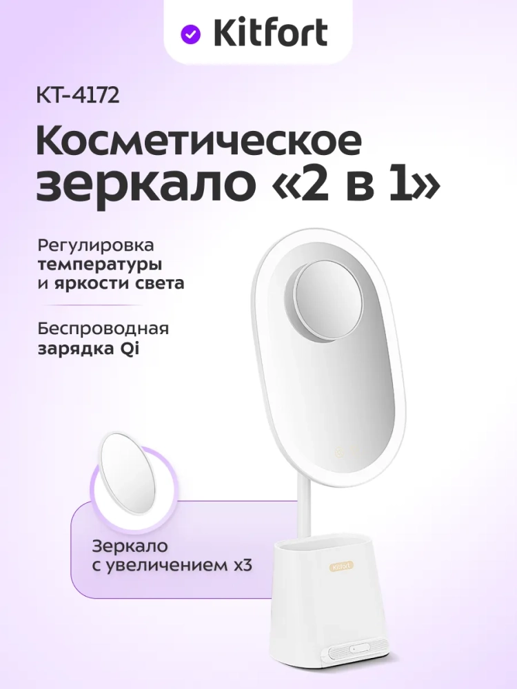 С косметическим зеркалом «2 в 1» Kitfort KT-4172 нанесение макияжа и проведение косметических процедур станет удобнее. Благодаря беспроводной зарядке, встроенной в подставку зеркала, вы можете заряжать телефон, часы или другие устройства, если они поддерживают функцию беспроводной зарядки. Разместив телефон на подставке, вы можете включить обучающее видео по макияжу или фейс-фитнесу и сразу опробовать на практике новые рекомендации. В подставке также есть место для хранения кистей для макияжа или других косметических принадлежностей.