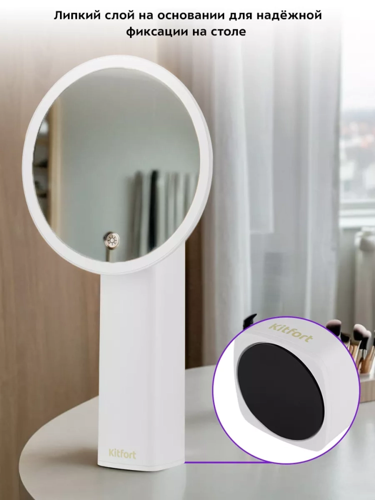 С косметическим зеркалом Kitfort KT-3183 нанесение макияжа и проведение косметических процедур станет удобнее. Зеркало устанавливается на стол, поэтому ваши руки остаются свободными и вам удобно наносить макияж. Угол наклона регулируется. Контурная подсветка зеркала поможет лучше разглядеть все мелкие детали даже в условиях недостаточного освещения в помещении. Подсветку можно отключить или настроить яркость.