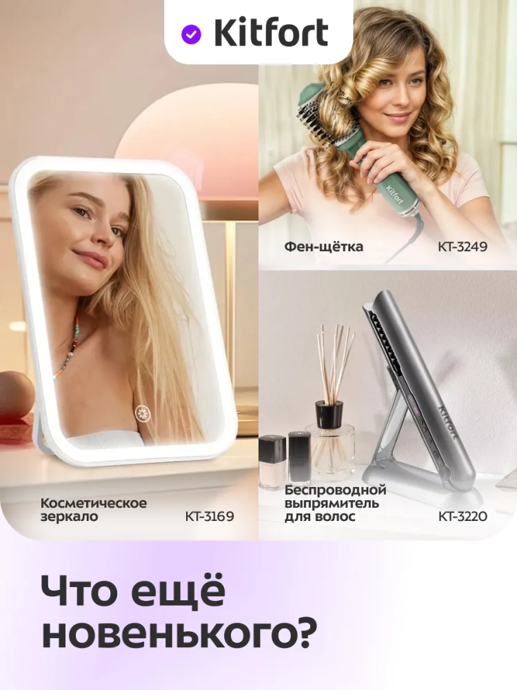 С косметическим зеркалом Kitfort KT-4120 нанесение макияжа и проведение косметических процедур станет удобнее. Благодаря пластиковой подставке зеркало устанавливается на стол, и вам не нужно держать его в руках во время косметических процедур. При необходимости вы также можете повесить устройство на стену, сняв его с подставки и надев стойку на крючок. Угол наклона зеркальной поверхности регулируется. Контурная подсветка центрального зеркала поможет лучше разглядеть все мелкие детали даже в условиях недостаточного освещения в помещении.