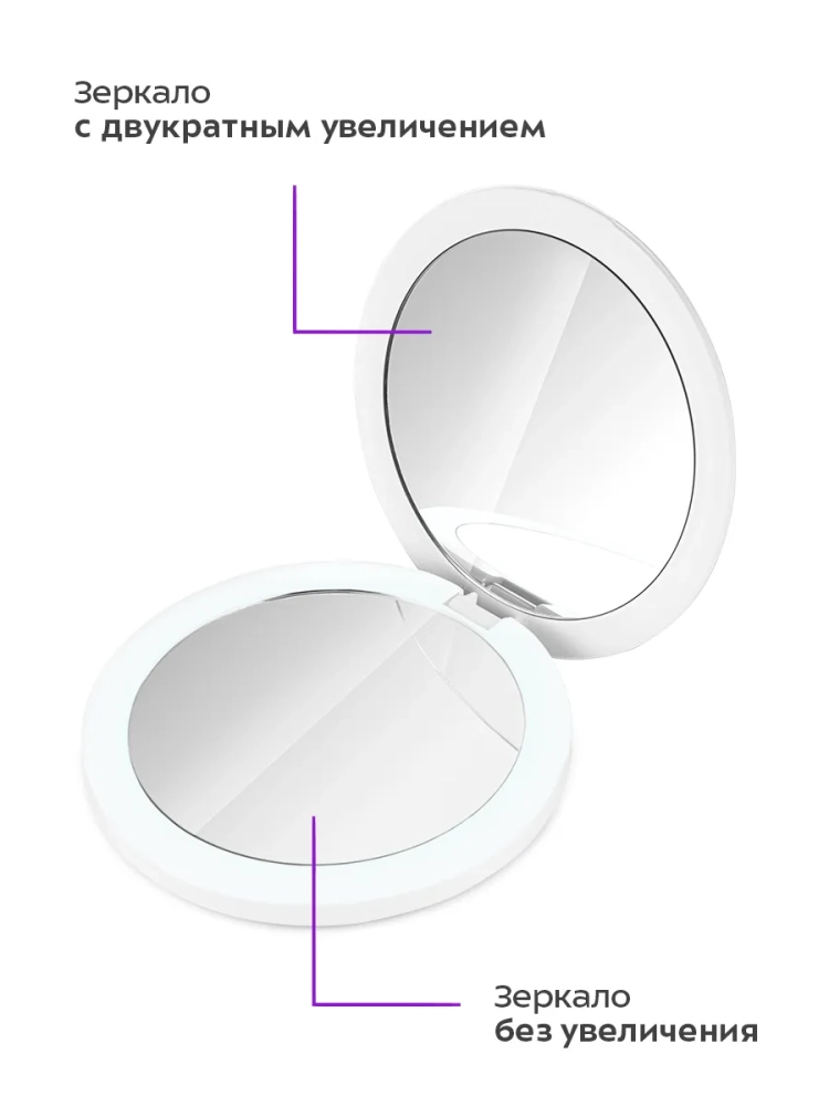 В корпус установлено зеркало без увеличения и зеркало с двукратным увеличением, которое позволит разглядеть мельчайшие детали, даже если у вас плохое зрение или если вы сняли очки для проведения косметических процедур.