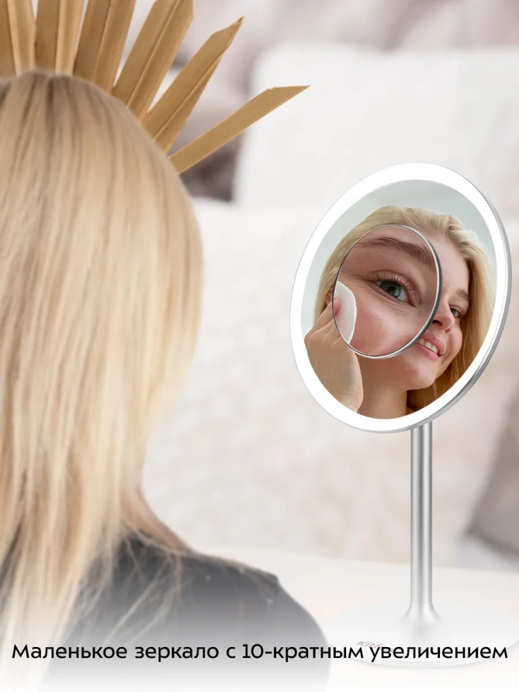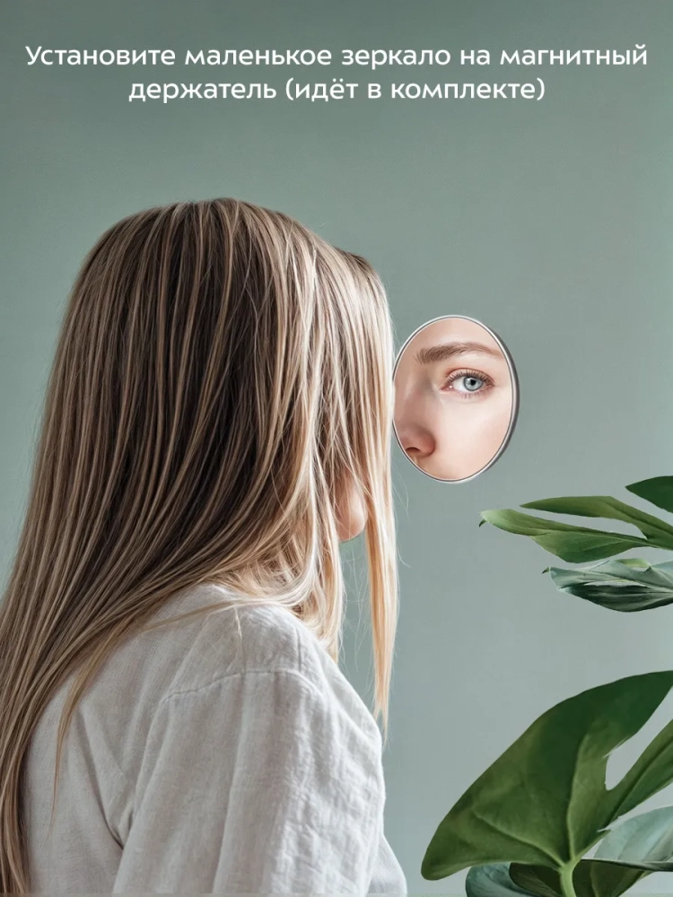 Маленькое зеркало с 10-кратным увеличением, которое крепится на магниты на центральную часть основного зеркала, поможет разглядеть даже самые мелкие детали. Благодаря креплению маленького зеркала ваши руки останутся свободными, вам удобнее будет наносить макияж.