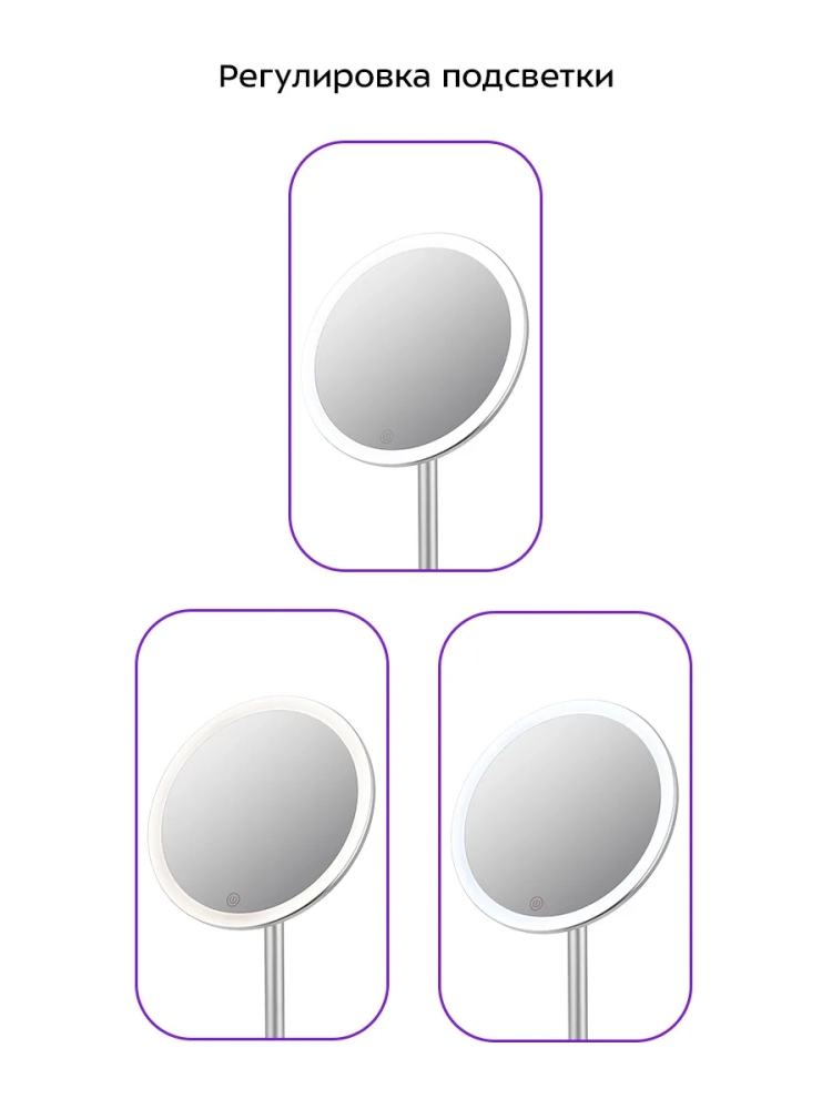 Контурная подсветка зеркала поможет лучше разглядеть все мелкие детали даже в условиях недостаточного освещения в помещении. Яркость подсветки можно настроить, а также выбрать холодный, нейтральный или теплый свет. Подсветка зеркала работает от встроенного аккумулятора. Это позволяет пользоваться зеркалом и включать подсветку в любом удобном месте.