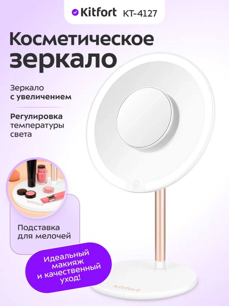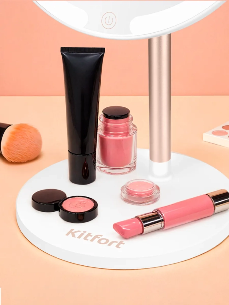 С косметическим зеркалом Kitfort KT-4127 нанесение макияжа и проведение косметических процедур станет удобнее. Зеркало устанавливается на подставку с магнитным держателем как на шарнир, благодаря этому вы можете поворачивать зеркало или регулировать угол наклона зеркальной поверхности.