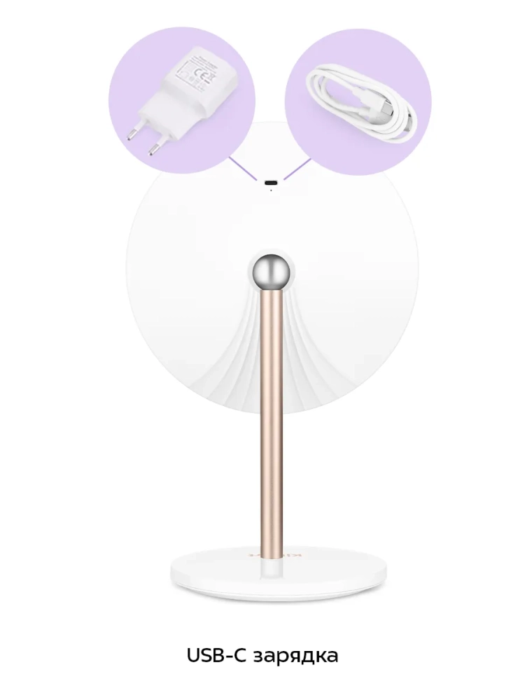Контурная подсветка зеркала поможет лучше разглядеть все мелкие детали даже в условиях недостаточного освещения в помещении. Яркость подсветки можно настроить, а также выбрать холодный, нейтральный или теплый свет. Подсветка зеркала работает от встроенного аккумулятора. Это позволяет пользоваться зеркалом и включать подсветку в любом удобном месте.