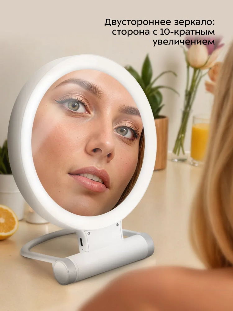 Зеркало двустороннее: одна сторона без увеличения, а вторая — с 10-кратным увеличением. Благодаря увеличению вы сможете разглядеть мельчайшие детали, даже если у вас плохое зрение и вы сняли очки для проведения косметических процедур.