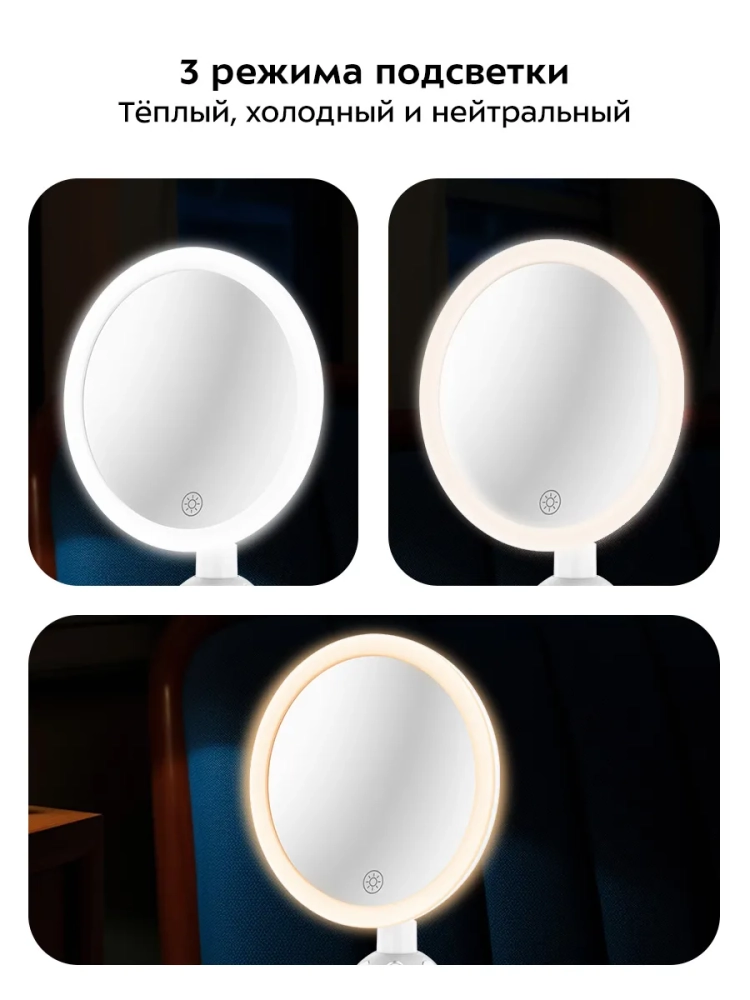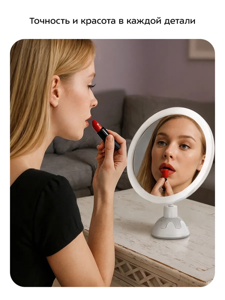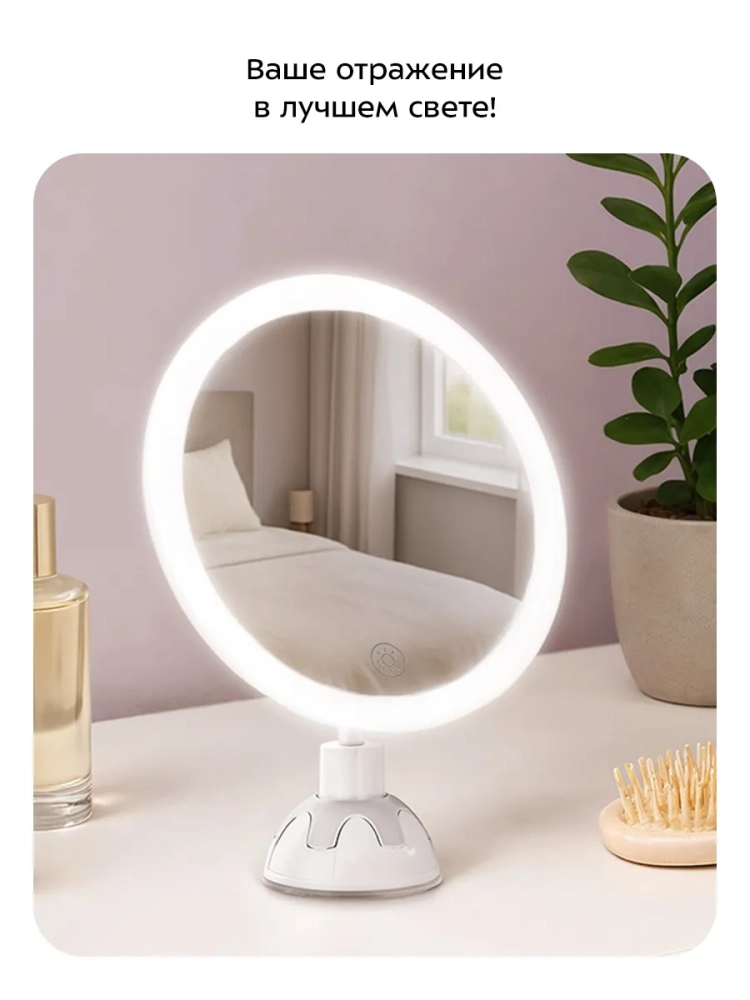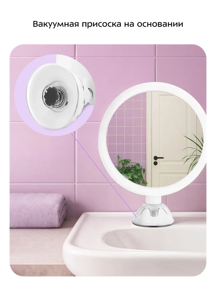 Зеркало крепится к горизонтальной или вертикальной гладкой поверхности на вакуумную присоску. Это очень удобно, так как вы можете расположить зеркало не только на столе, но и прикрепить к стене в любом удобном месте. Также ваши руки останутся свободными, и вам будет удобно наносить макияж. Контурная подсветка зеркала поможет лучше разглядеть все мелкие детали даже в условиях недостаточного освещения в помещении. Подсветку можно включить, отключить, выбрать цветовую температуру или настроить яркость.