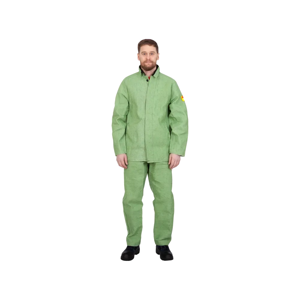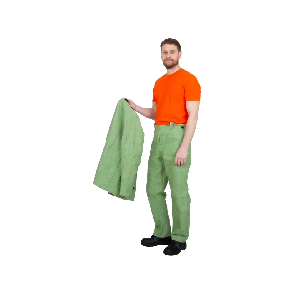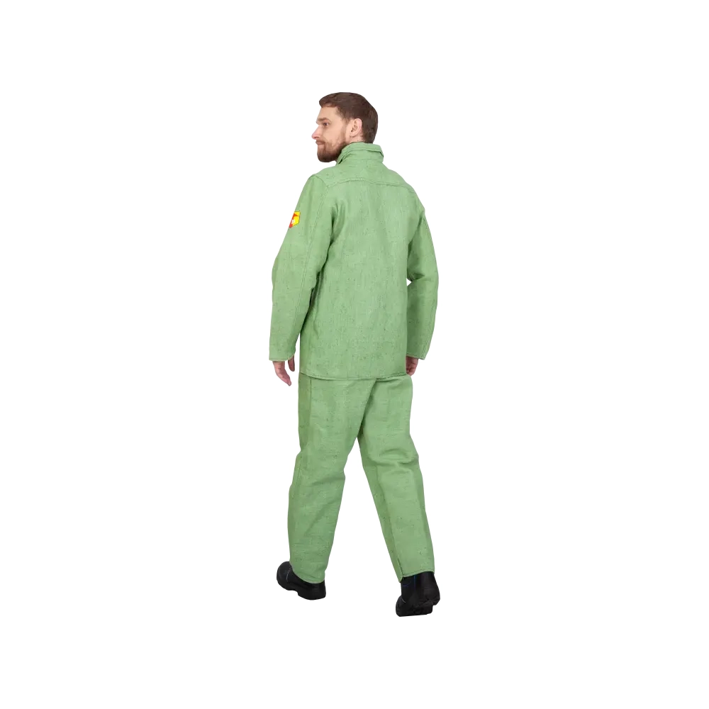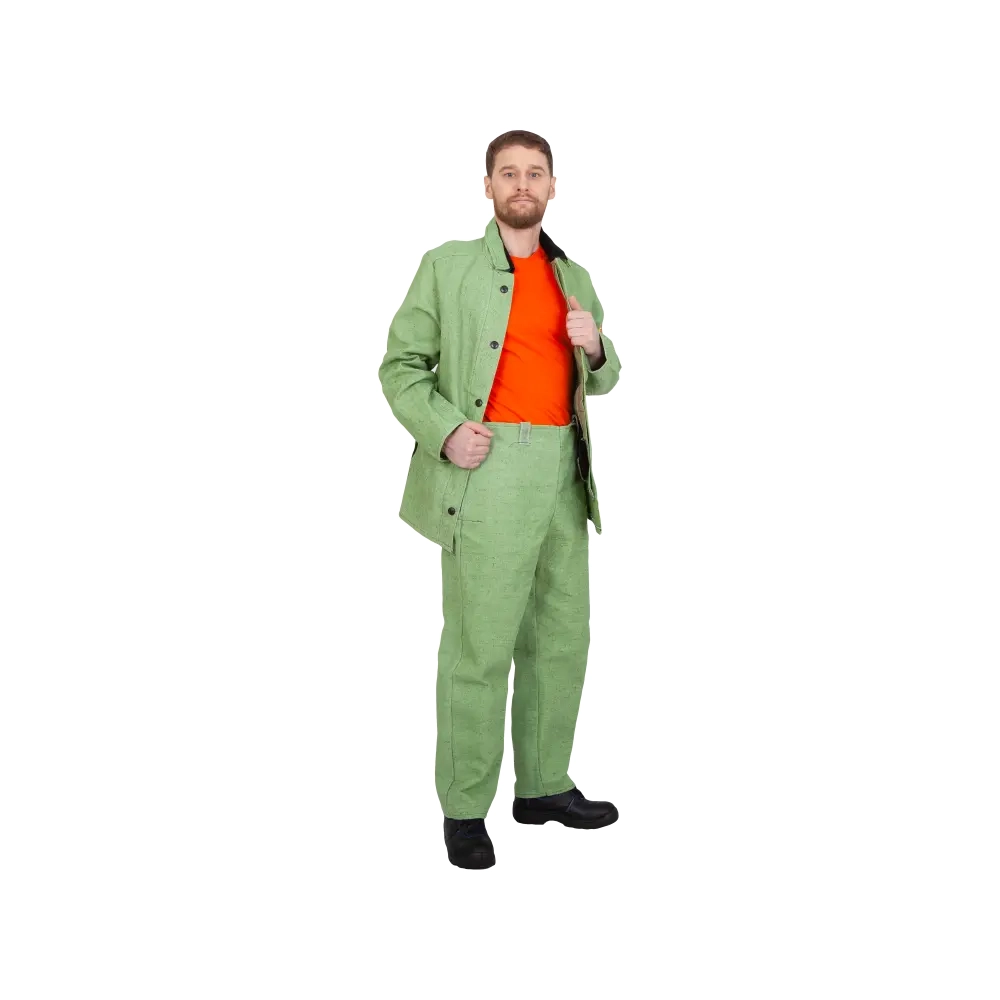 Костюм выполнен из огнеупорного высококачественного брезента повышенной плотности. Дополнительные накладки применяются в местах наибольшего внешнего воздействия на костюм. Прямой покрой куртки и брюк, а также отсутствие открытых частей тела позволяют исключить попадание брызг металла на тело сварщика и на складки его спецодежды.