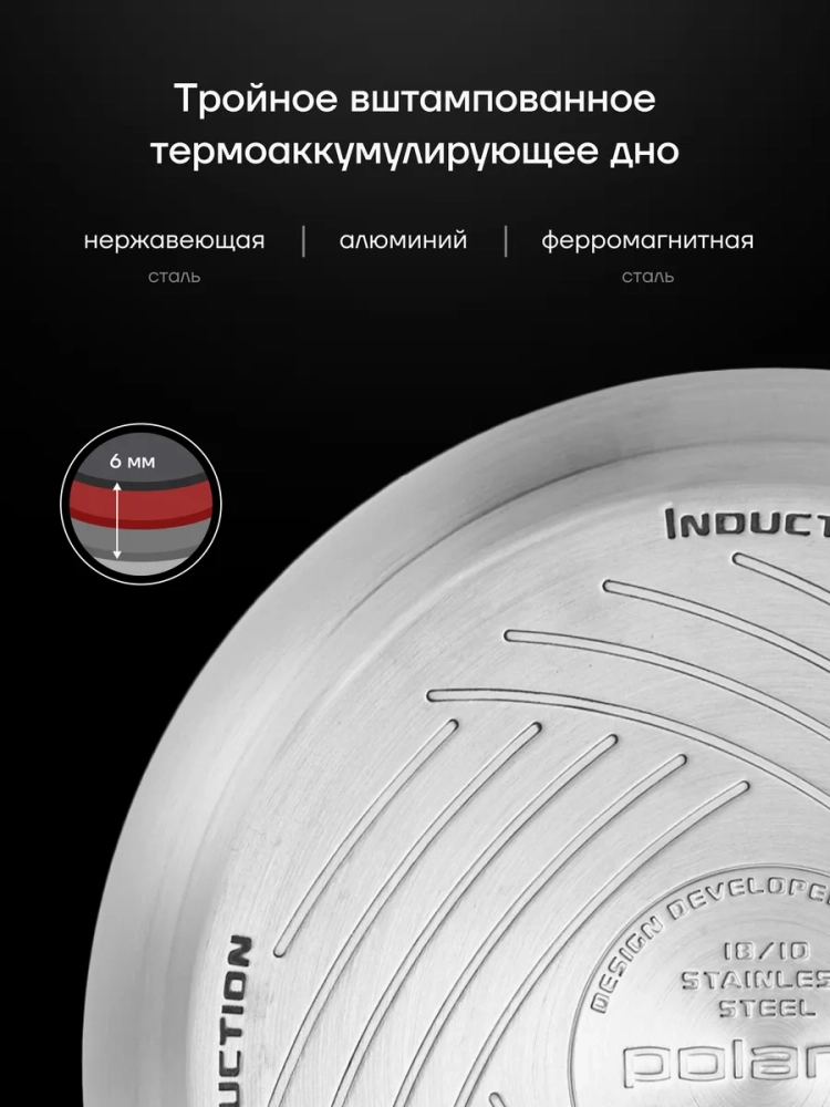Коллекция посуды Polaris Mela изготовлена из высококачественной нержавеющей стали и соответствует европейским стандартам качества. Стальная утварь отличается прочностью, долговечностью и обладает антибактериальными свойствами, что делает ее гигиеничной и безопасной для приготовления пищи. Изделия из стали прослужат намного дольше, чем эмалированная и алюминиевая посуда. Срок эксплуатации - 30 лет.