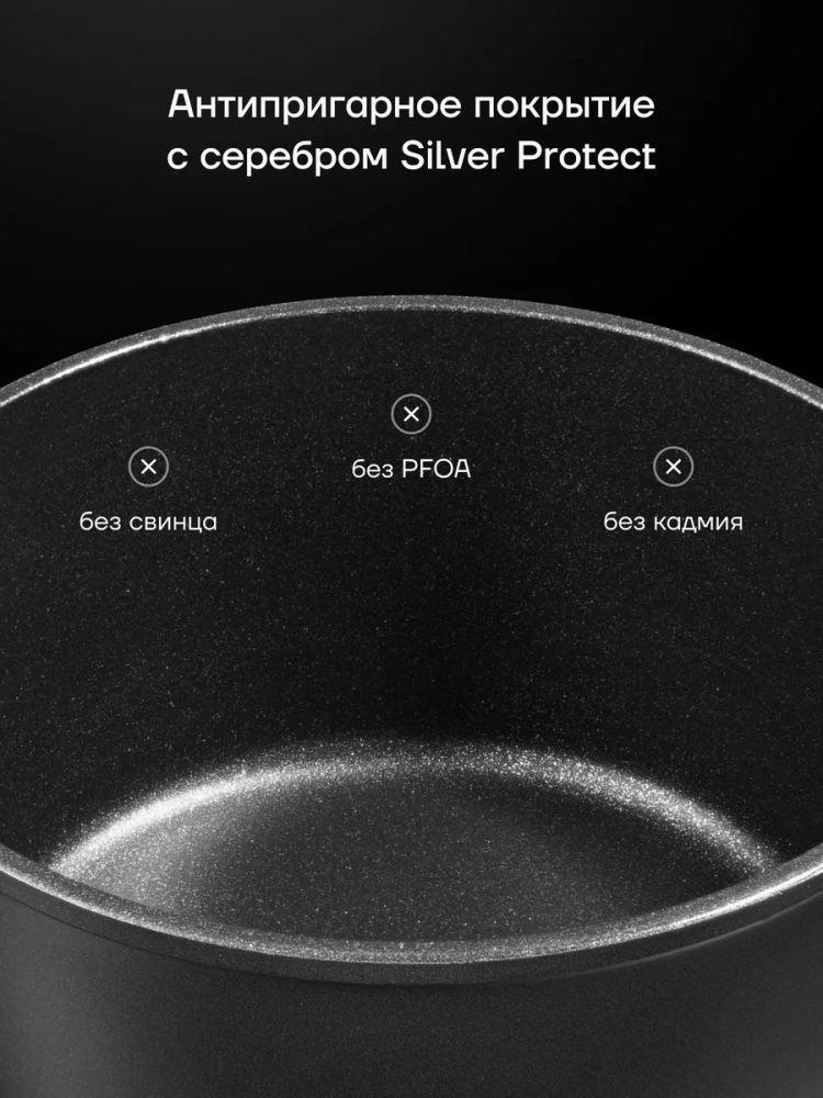 Инновационное трехслойное антипригарное покрытие SILVER PROTECT с добавлением серебра обеспечивает непревзойденную прочность, защищает от царапин, механических повреждений и предотвращает пригорание пищи. С антипригарным покрытием SILVER PROTECT вы с легкостью приготовите любые блюда без использования масла или жира и сможете сохранить их натуральный вкус!