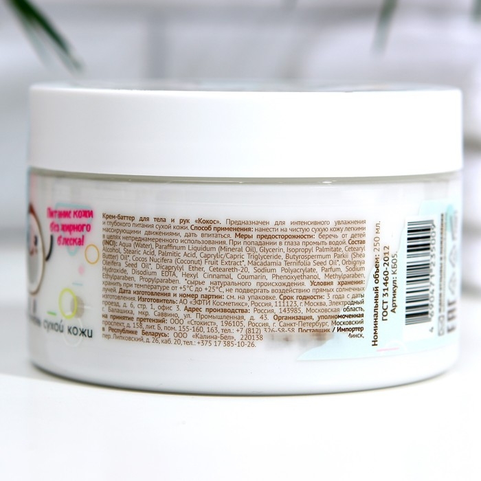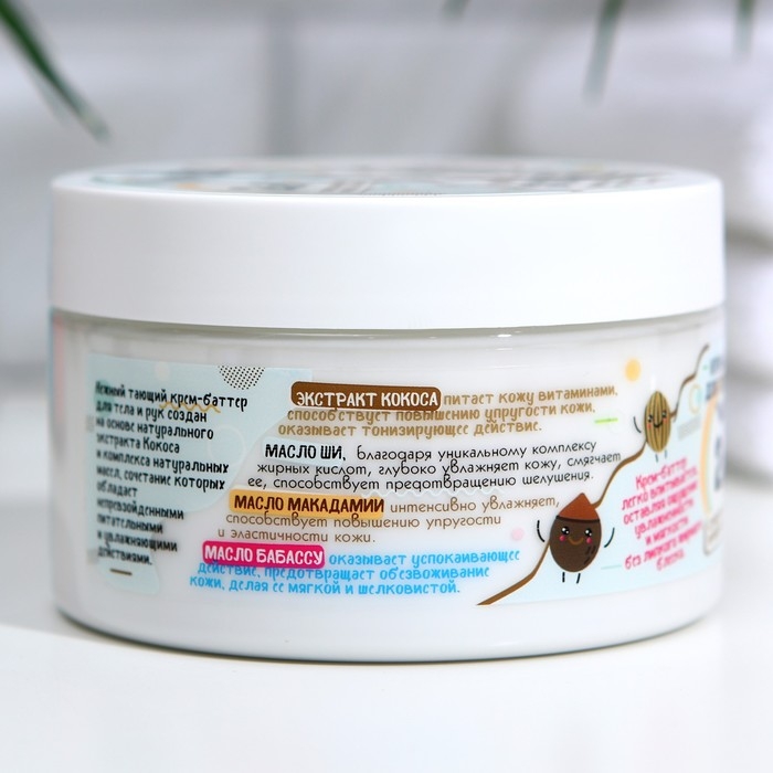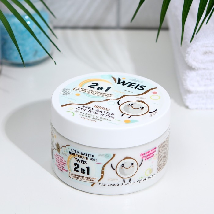 Крем-баттер для тела WEIS кокос, 250 мл. Предназначен для интенсивного увлажнения и глубокого питания сухой кожи. Нежный тающий крем-баттер для лица и тела создан на основе натурального экстракта Кокоса и комплекса натуральных масел, сочетание которых обладает непревзойденными питательными и увлажняющими действиями. Крем-баттер легко впитывается, оставляя ощущение увлажненности и мягкости без липкого жирного блеска. Экстракт кокоса питает кожу витаминами, способствует повышению упругости кожи, оказывает тонизирующее действие. Масло ШИ, благодаря уникальному комплексу жирных кислот, глубоко увлажняет кожу, смягчает ее, способствует предотвращению шелушения. Масло макадамии интенсивно увлажняет, способствует повышению упругости и эластичности кожи. Масло бабассу оказывает успокаивающее действие, предотвращает обезвоживание кожи, делая ее мягкой и шелковистой.