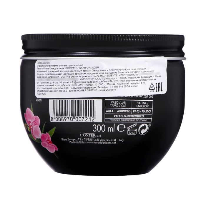 Tesori d'Oriente крем для тела "Китайская орхидея". Мягкая и очень легкая текстура делает кожу бархатистой и ароматной. Крем обогащен успокаивающими и питательными ингредиентами, осветляет и увлажняет кожу. Ежедневное наслаждение после ванны или душа. Подходит для ежедневного использования.