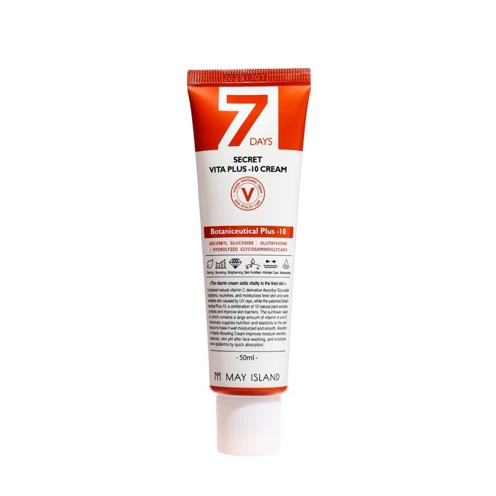 Эффективная защита для вашей кожи с комплексом из сильнейших антиоксидантов — это витаминный крем для лица от бренда May Island! Корейский витаминный крем May Island 7 Days Secret Vita Plus-10 Cream помогает сохранять яркость, эластичность кожи, прекрасно увлажняет и сохраняет оптимальный баланс влаги, в целом оказывает оздоравливающий и омолаживающий эффект.