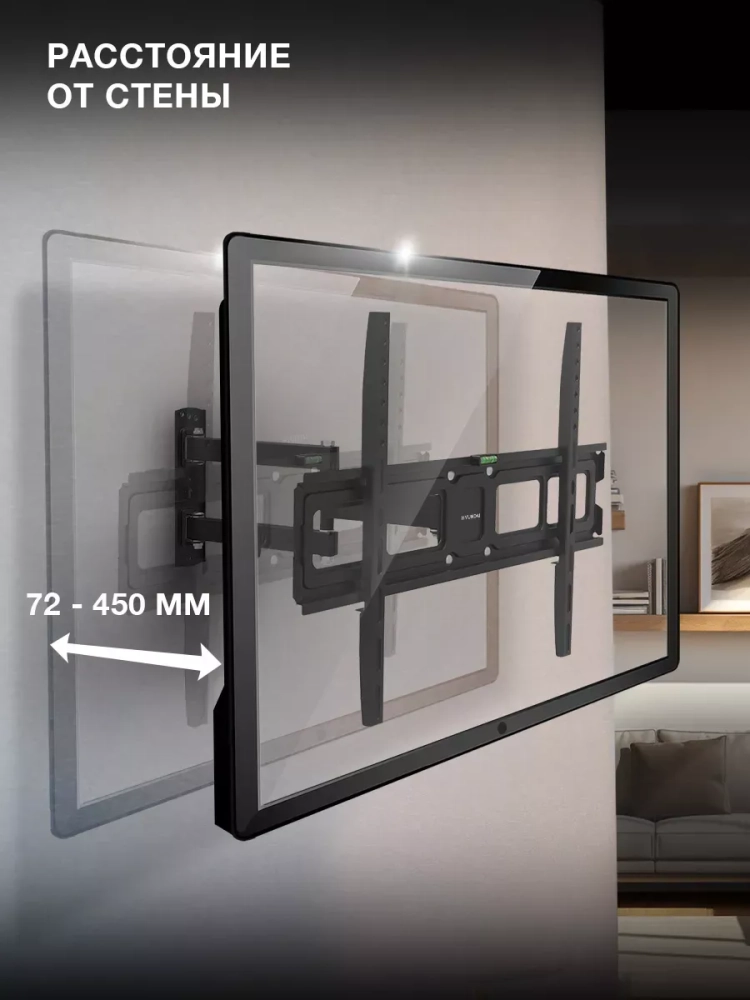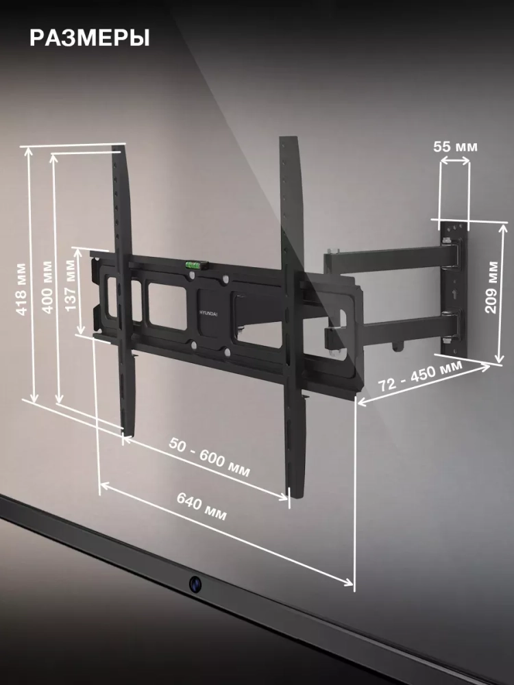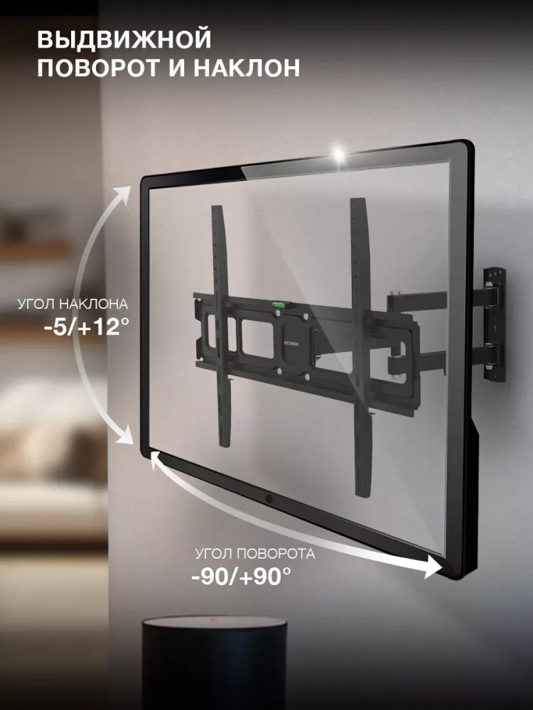 Ещё одно достоинство конструкции Hyundai GL-N4 – двухрычажный выносной механизм. Он позволяет изменять расстояние от стены до телевизора в диапазоне от 72 до 450 мм, а также поворачивать его на 90 градусов влево или вправо. В сочетании с возможностью наклона на 5 градусов вверх или на 12 градусов вниз это раскрывает широкие возможности для выбора места размещения монитора и регулирования положения экрана для наиболее комфортного обзора из любой точки комнаты.