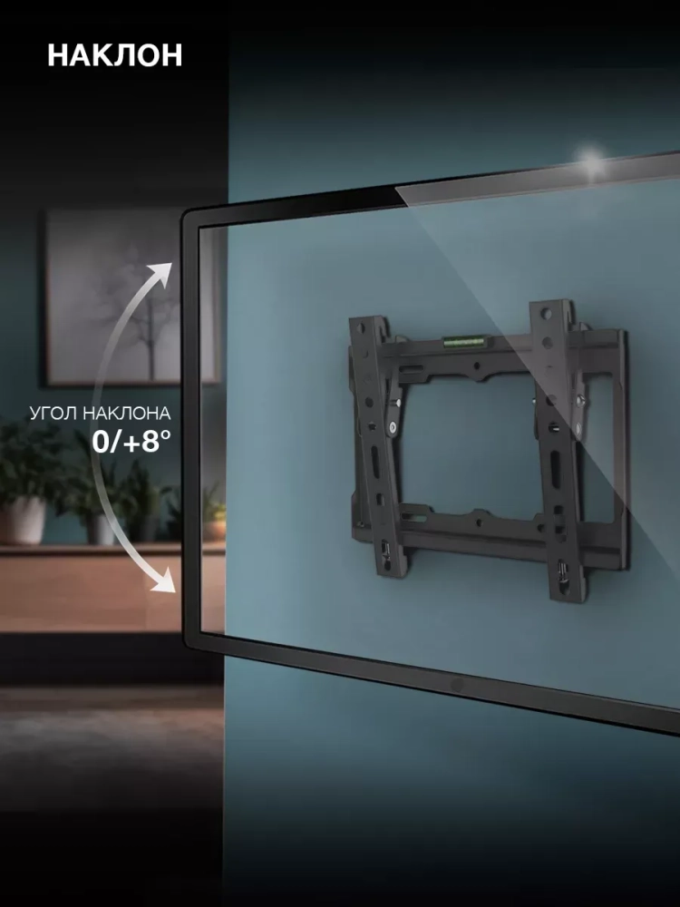 Шарнирное крепление кронштейна Hyundai GL-T1 обеспечивает возможность наклона телевизора до 8 градусов вниз, что позволяет при необходимости разместить его ближе к потолку, сохранив удобный угол обзора с дивана или кровати.