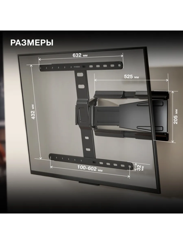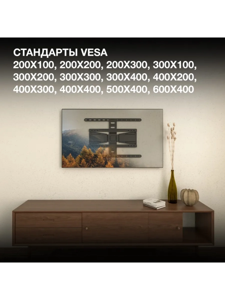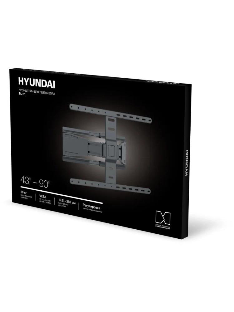 Кронштейн для телевизора Hyundai SL-F1 черный, рекомендуемая диагональ 43"-90", максимальная нагрузка 50кг, настенный, поворотно-выдвижной и наклонный, угол наклона +3/-15, угол поворота -30/+30, (HMS90FD350BK16) Поддержка крепления VESA: 100x200, 200x100, 200x200, 200x300, 300x100, 300x200, 300x300, 300x400, 400x200, 400x300, 400x400, 500x400, 600x400