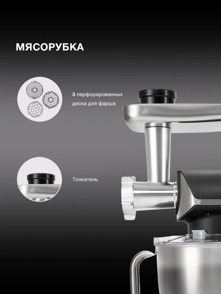 Комплект цельнометаллических насадок прослужит долго и сыграет множество важных ролей. Насадка венчик отлично подойдет для взбивания, а мясорубка для приготовления фарша. При помощи блендера можно сделать смузи, а также измельчить лед или орехи. Для замешивания теста можно использовать насадку-крюк, а для однородных смесей – насадку-лопатку. С этой машиной Вы можете забыть об ограничениях.