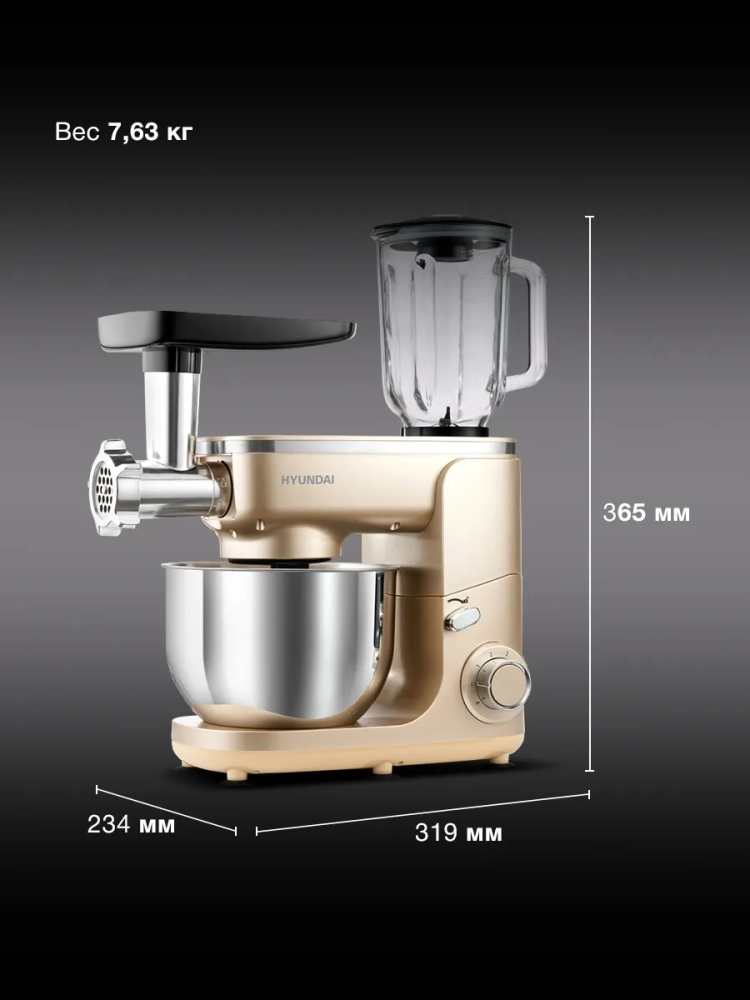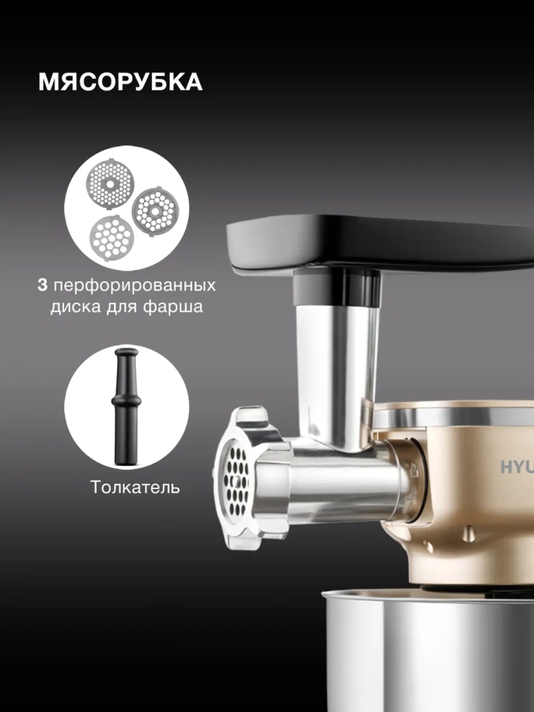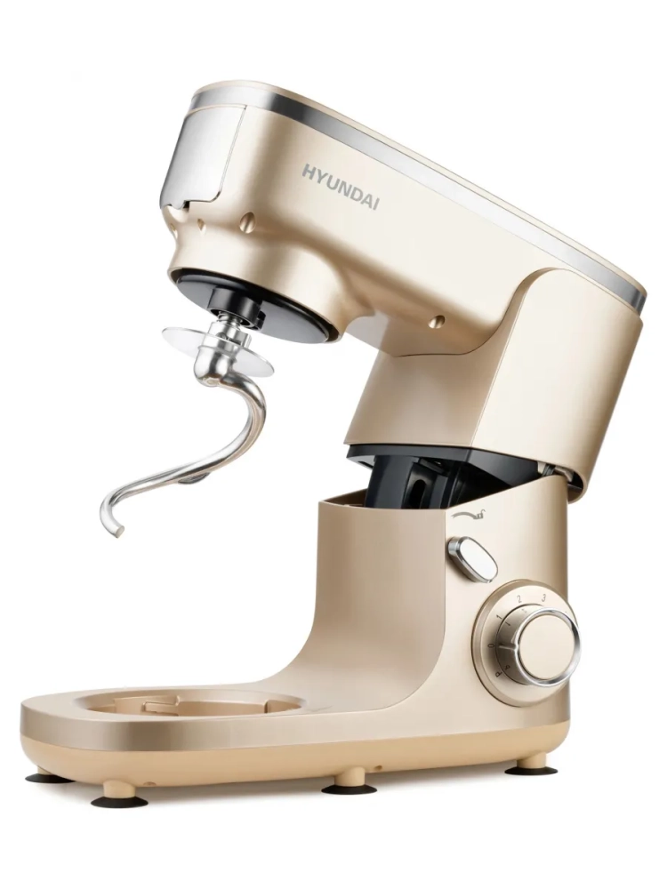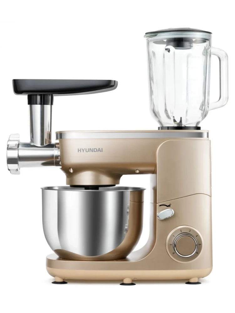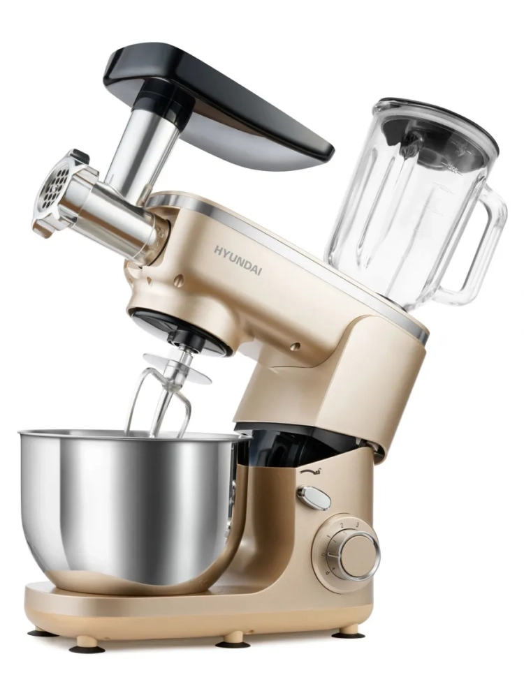 Кухонная машина Hyundai HYMS7451, планетарное вращение, мощность 1400Вт, количество скоростей 6, насадок 5, золотистый.