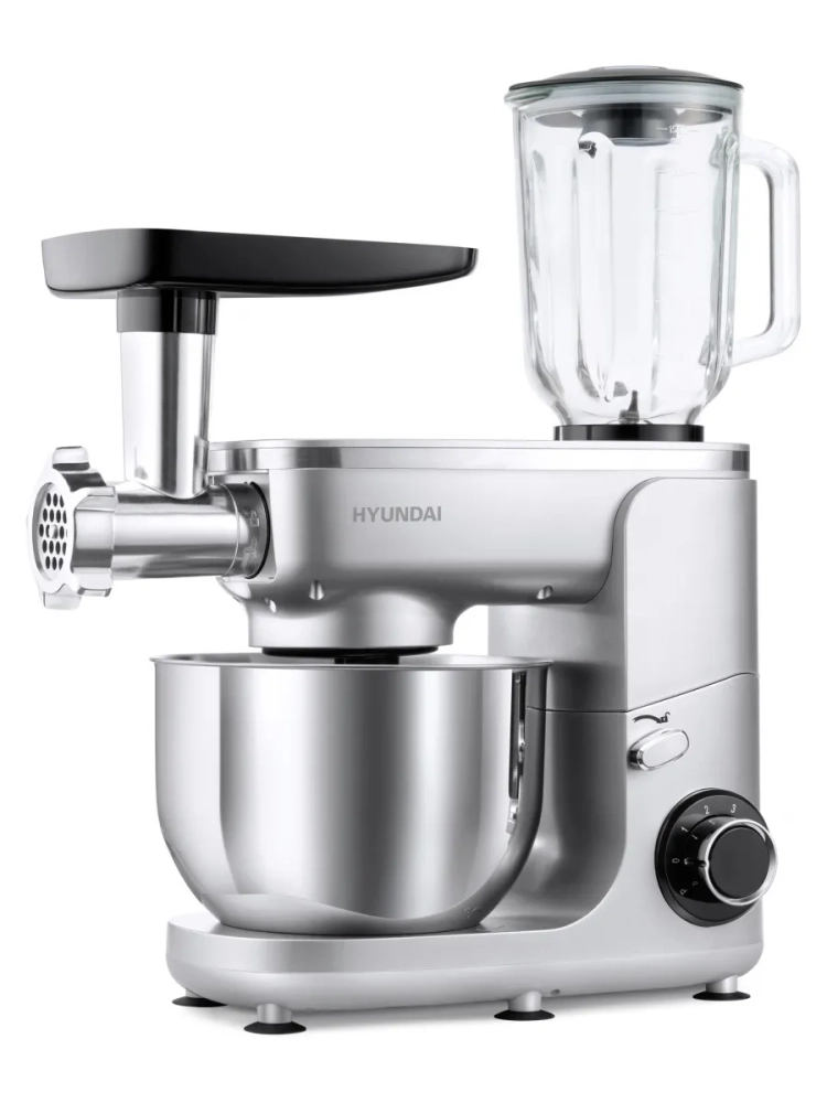 Кухонная машина Hyundai HYMS7651, планетарное вращение, мощность 1400Вт, количество скоростей 6, насадок 5, серебристый. Регулировка скорости. Максимальное время непрерывной работы 8 мин.