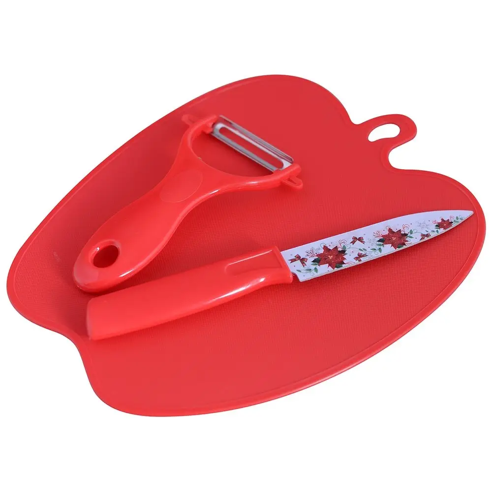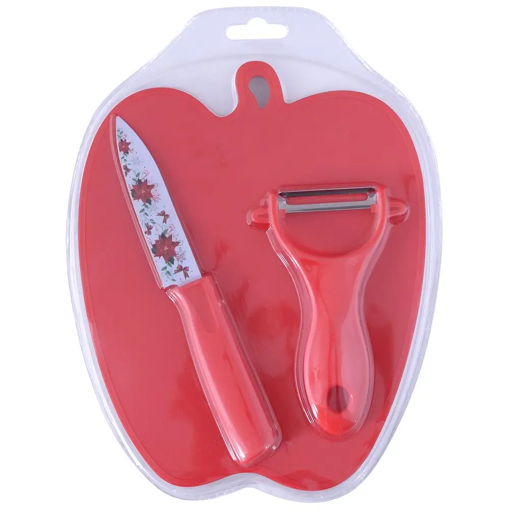 Размеры: разделочная доска - 17,5х22 см; нож - общая длина 19 см, длина лезвия 9,5 см; овощечистка - 12х7,5 см.