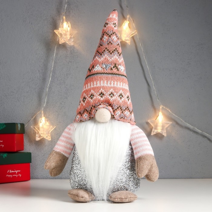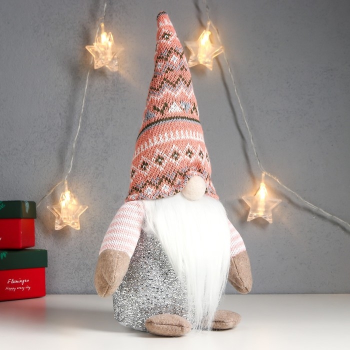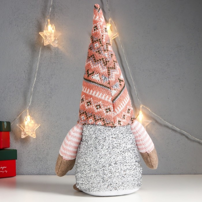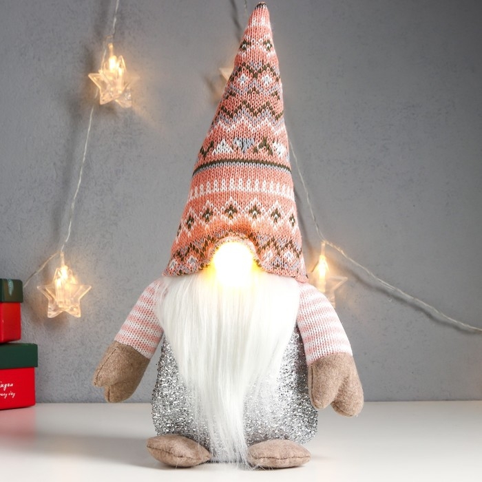 Кукла интерьерная свет "Дед Мороз светящийся нос, в розовом колпаке с узорами" 33х17х12 см