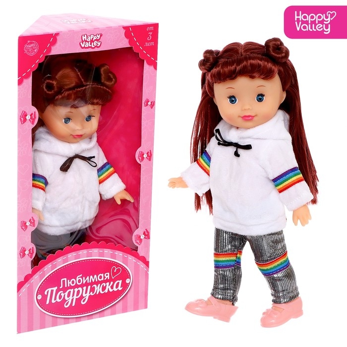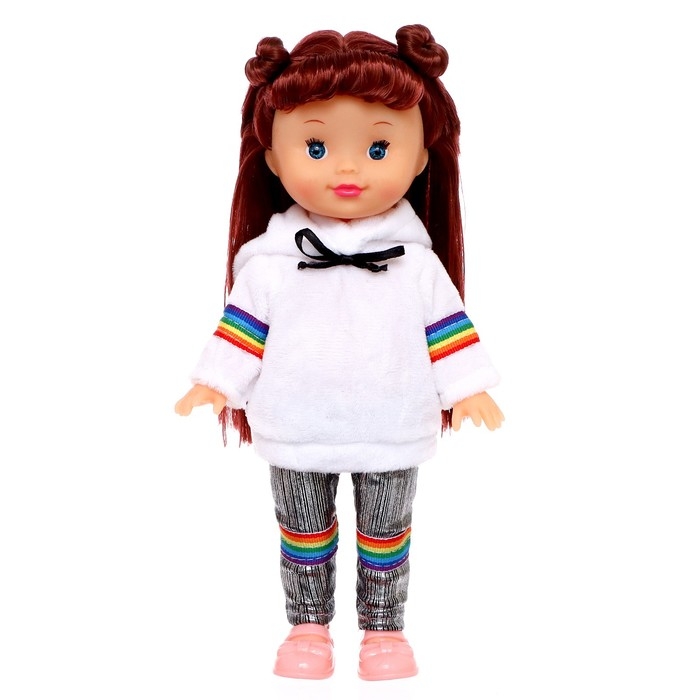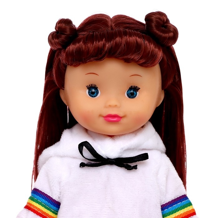 У куклы красивые длинные волосы. Девочка расчешет их и сделает модную укладку. Стильный спортивный костюмчик снимается. Ребёнок может искупать куклу и уложить её спать.
