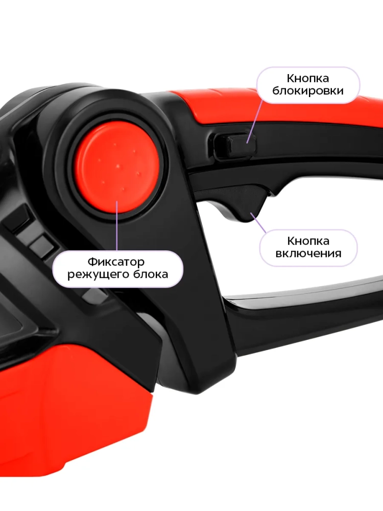 Устройство оснащено системой блокировки от случайного включения. Для включения кустореза необходимо сначала нажать и удерживать кнопку блокировки, а затем нажать и удерживать кнопку включения.