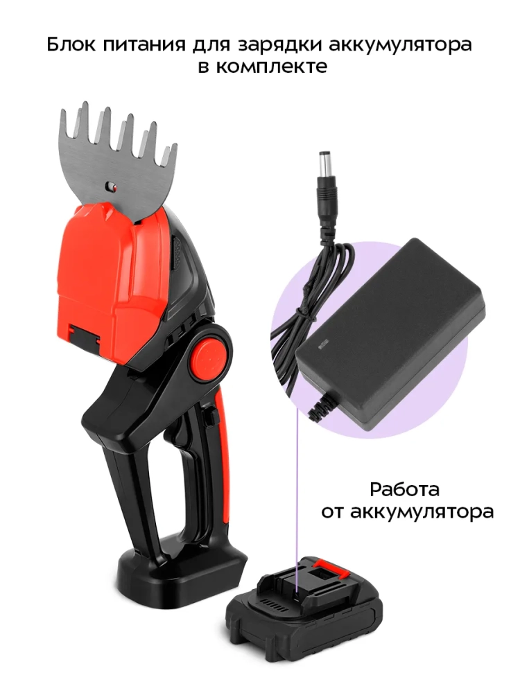 Благодаря работе от аккумулятора кусторез не нужно включать в розетку, при этом провода не будут мешать во время работы. При полном заряде аккумулятора кусторез может работать до 1 часа.