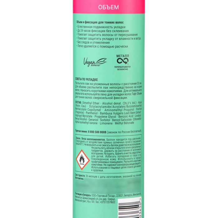 Лак для волос Тафт «Объём», для тонких волос, сверхсильная фиксация, 225 мл