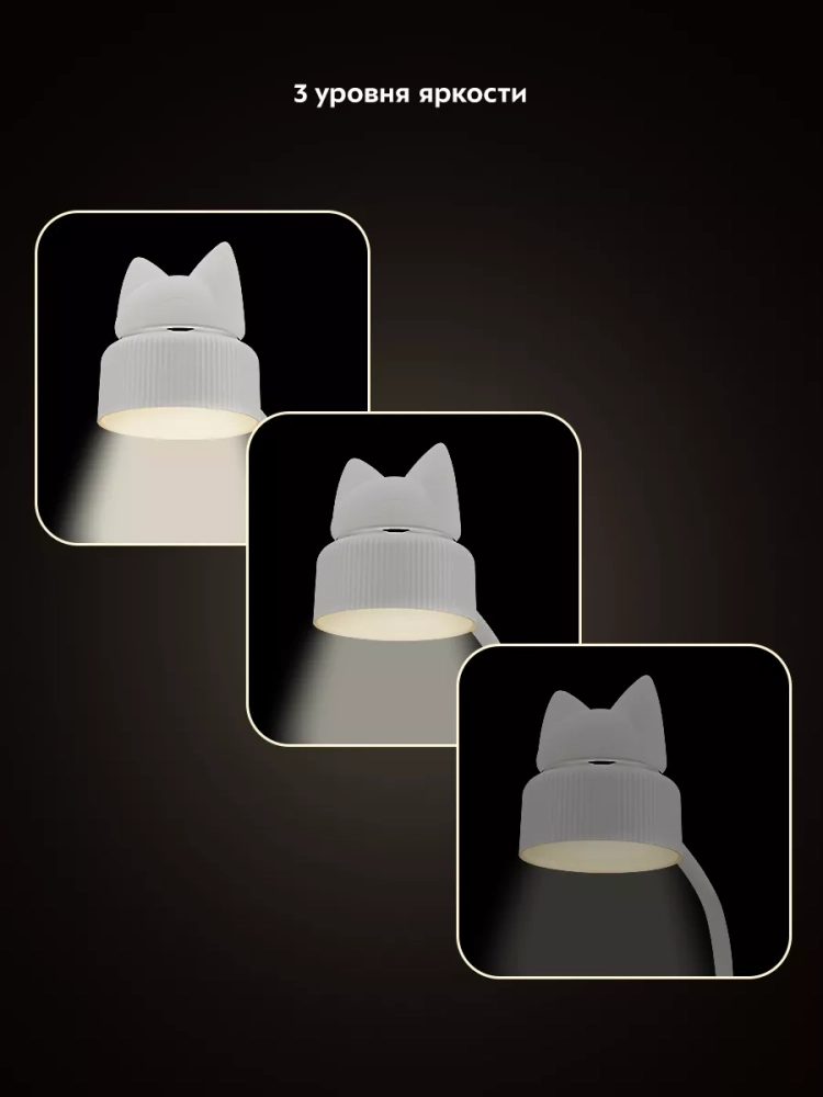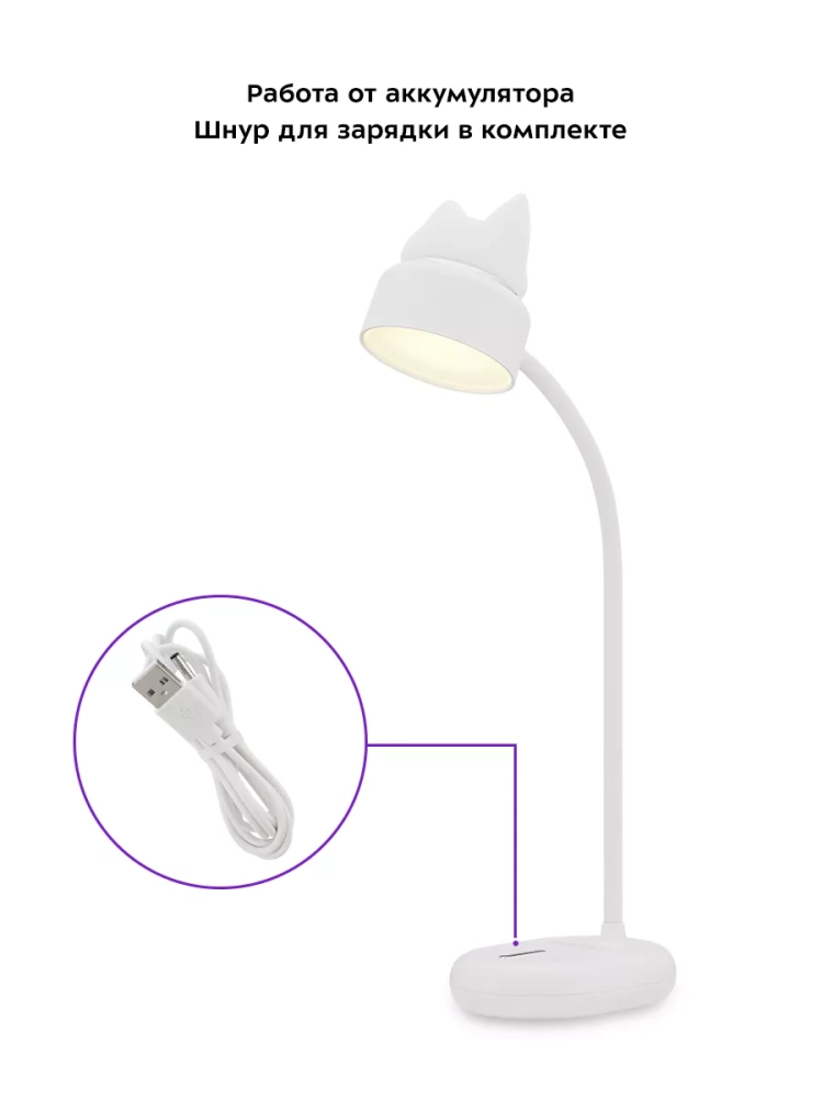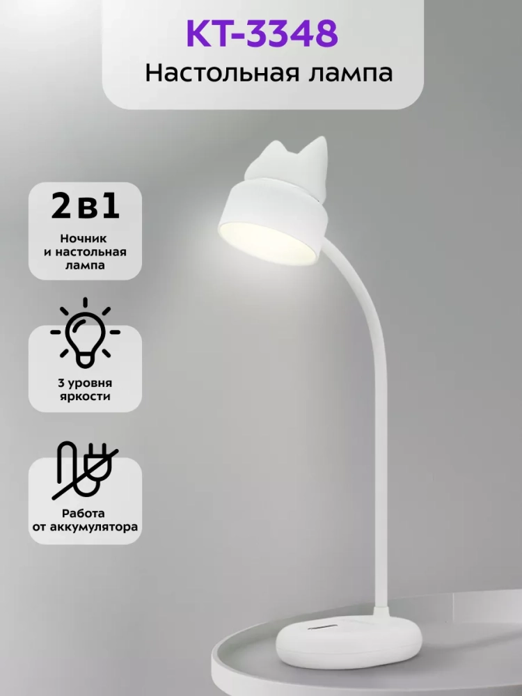 У лампы КТ-3348 штанга поворачивается в любую сторону, благодаря этому вы можете отрегулировать необходимое положение лампы. Верхняя часть рассеивателя, на которой находится декоративная накладка в форме головы кошки, работает как ночник. Ночник и свет настольной лампы можно включать одновременно и раздельно друг от друга.
