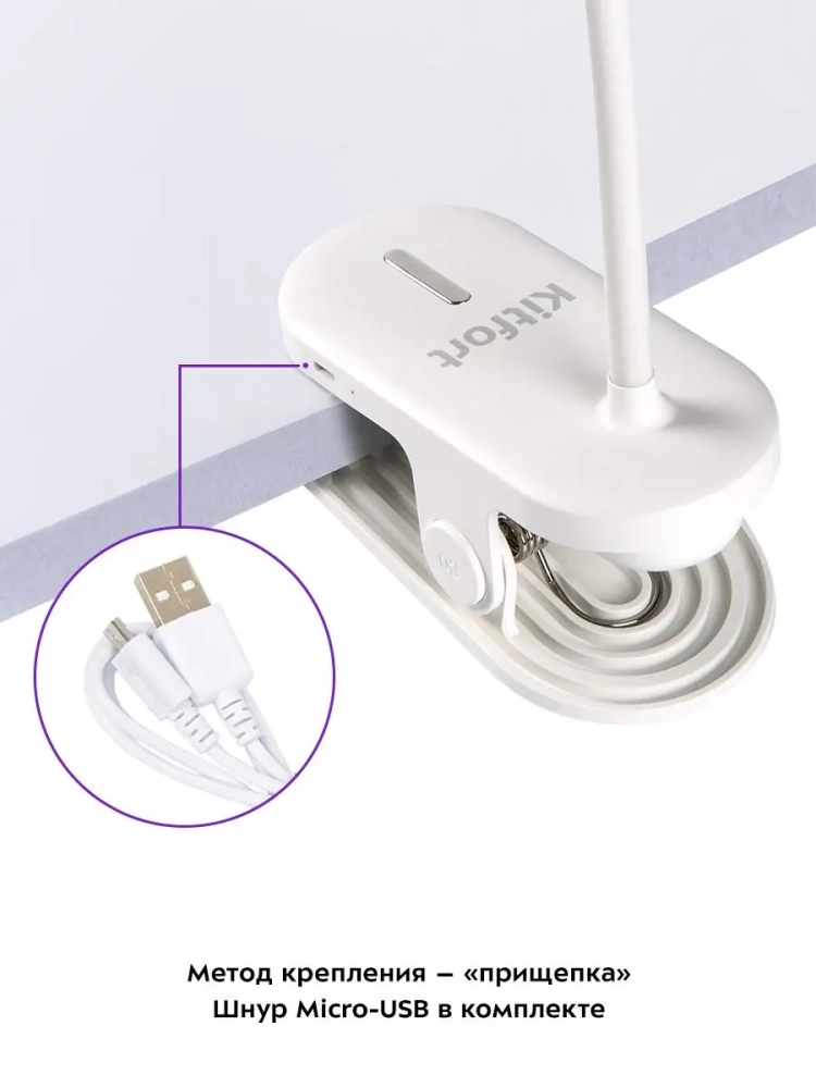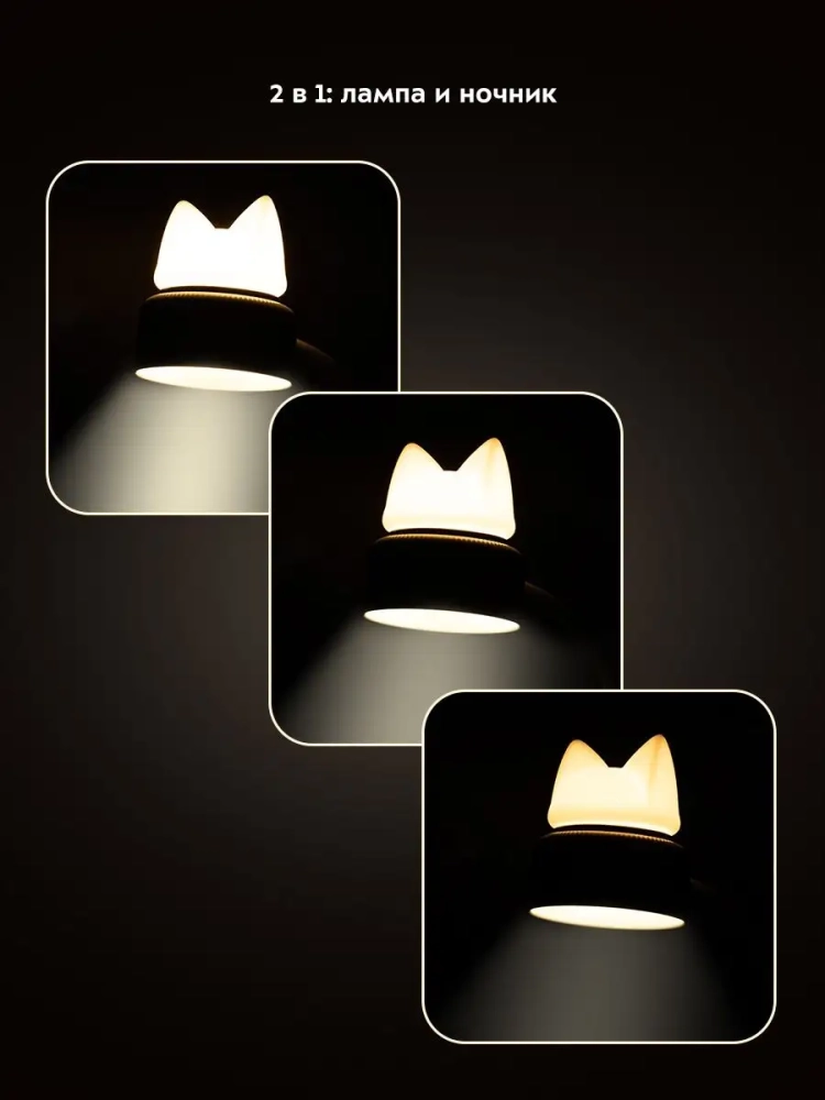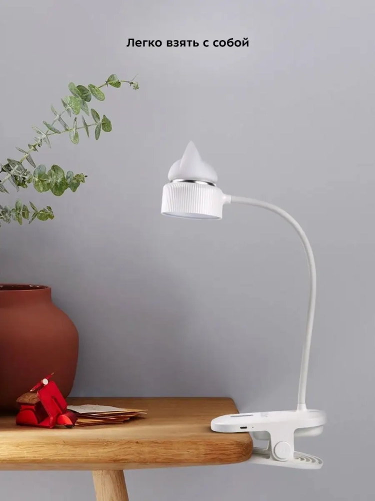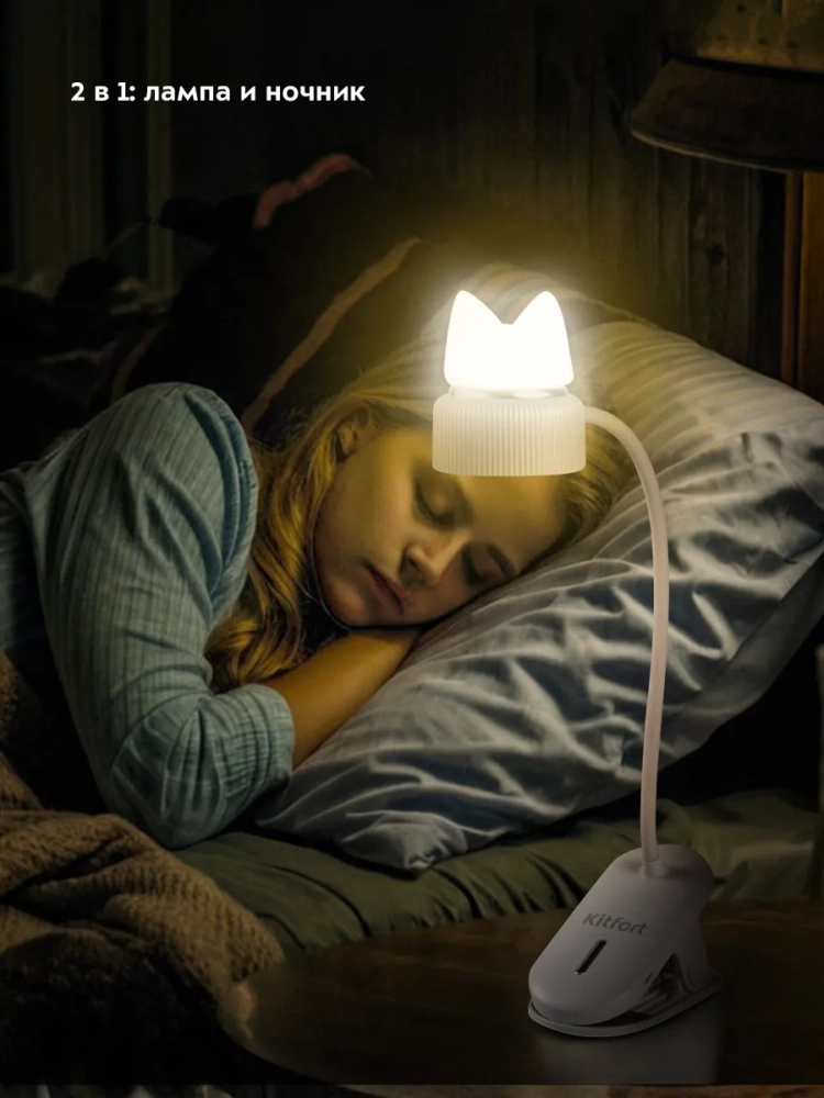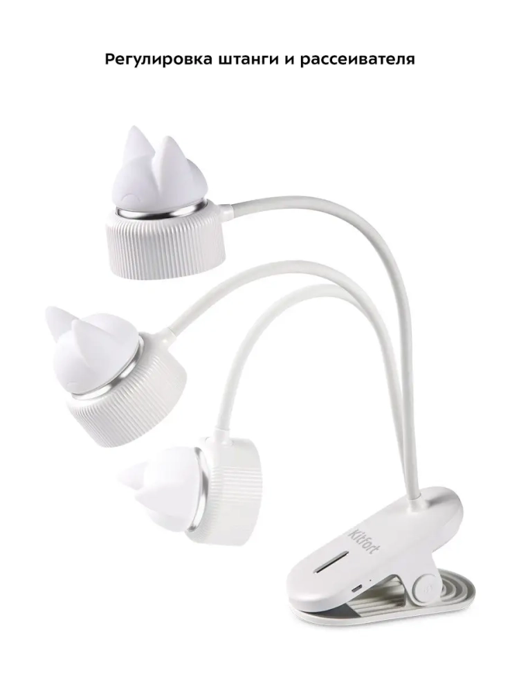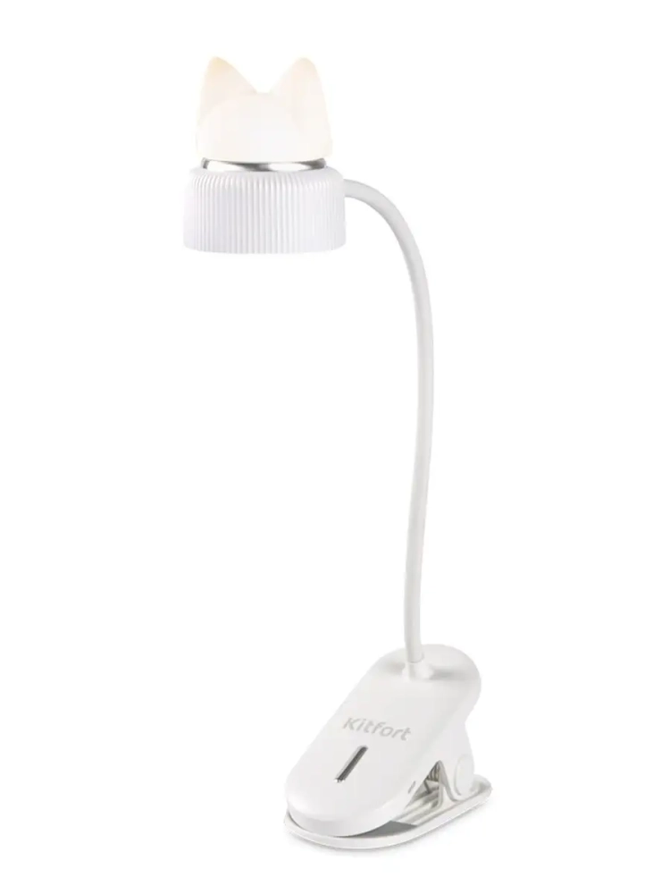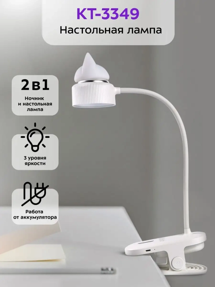 У лампы КТ-3349 штанга поворачивается в любую сторону, благодаря этому вы можете отрегулировать необходимое положение лампы. Крепится устройство к столешнице или полке с помощью прищепки. Верхняя часть рассеивателя, на которой находится декоративная накладка в форме головы кошки, работает как ночник. Ночник и свет настольной лампы можно включать одновременно и раздельно друг от друга.