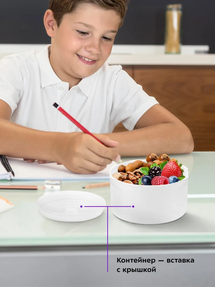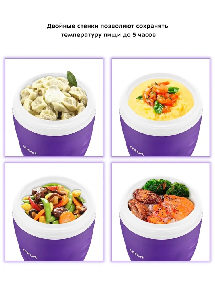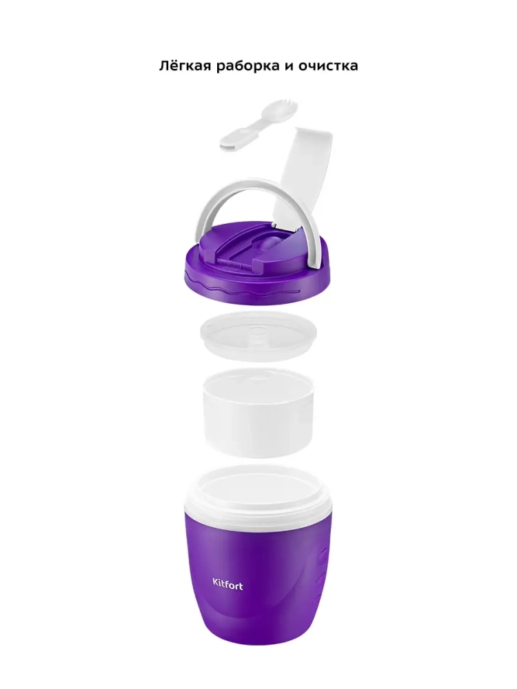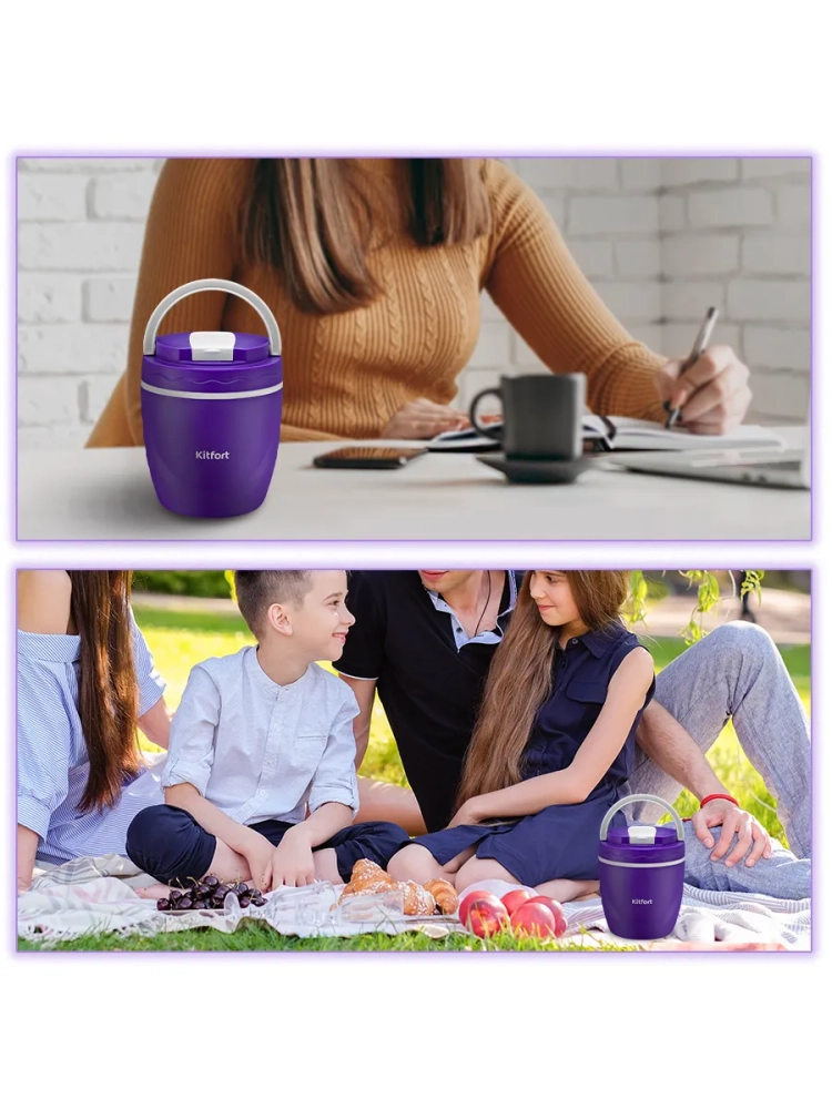 Ланч-бокс Kitfort KT-1217 позволяет вам взять блюда с собой, куда бы вы ни собирались. Благодаря двойным стенкам ланч-бокс сохранит температуру и вкус ваших блюд, которые вы берете с собой в дорогу и на пикник, на работу и в школу. Благодаря складной ручке ланч-бокс удобно переносить. Складная ложка-вилка размещается в крышке ланч-бокса и подходит для любого блюда благодаря своей универсальной конструкции. Внутри ланч-бокса есть специальный контейнер-вставка с крышкой для снеков, что очень удобно при необходимости взять с собой разные блюда или основное блюдо и небольшой перекус. Крышка ланч-бокса закручивается на резьбу, что предотвращает случайное открывание в дороге. Ланч-бокс Китфорт KT-1217 подходит только для твердой или сухой пищи и не предотвращает протекание. Емкость ланч-бокса - 1 литр, что позволяет взять с собой порцию для 1-2 человек. Ланч-бокс изготовлен из полипропилена и не содержит бисфенол А (BPA-free), что делает ланч-бокс легким и безопасным для здоровья.