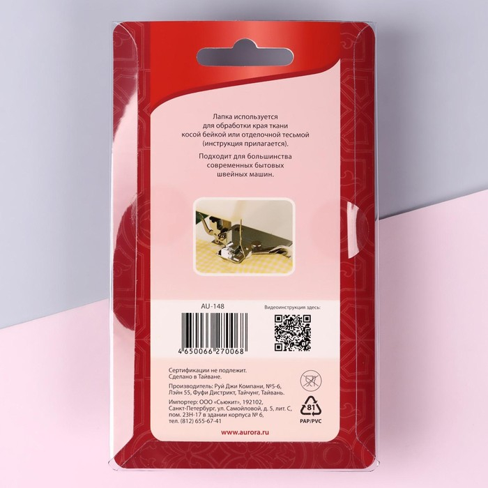 Лапка для швейных машин, для окантовки срезов косой бейкой, без адаптера, 5,5 × 2,9 × 2,2 см
