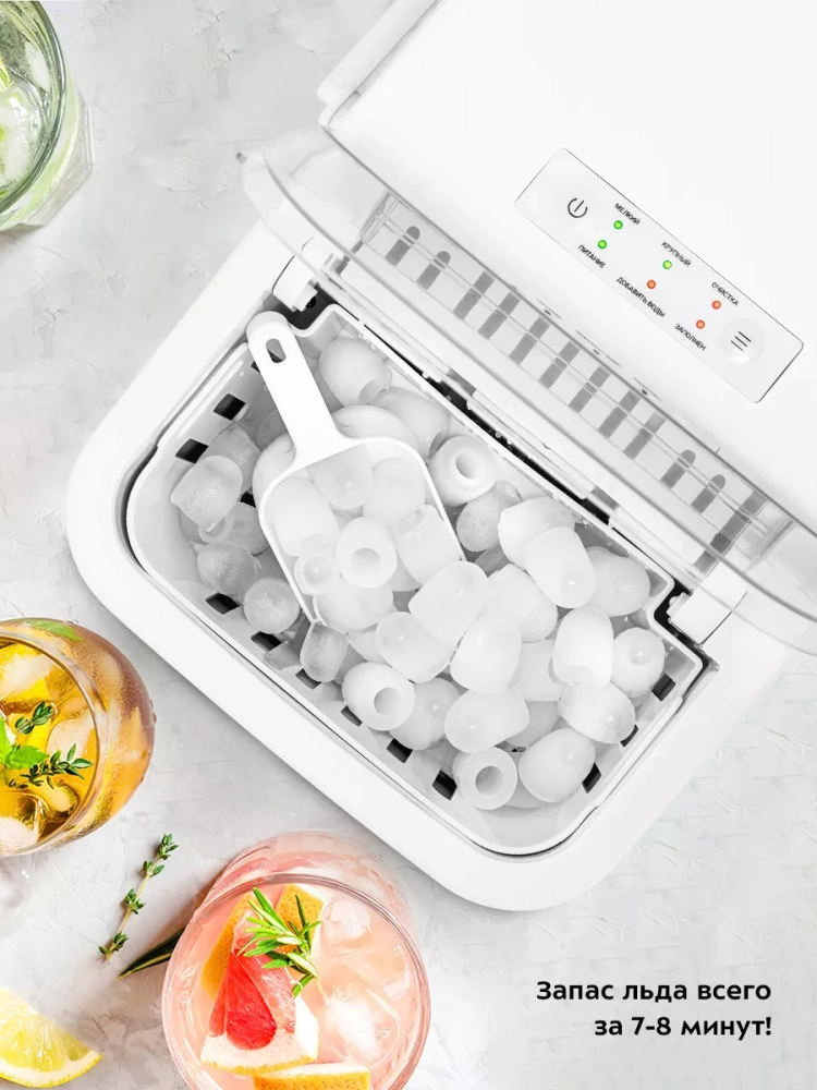 Льдогенератор для дома мощностью 100 Вт и объемом резервуара 1.5 л — это идеальное решение для кухни, дачи или небольшого бара. Этот мини прибор быстро и эффективно производит лед, что делает его незаменимым для охлаждения напитков и приготовления коктейлей. Время генерации одной порции льда составляет всего 7–8 минут, что значительно быстрее, чем в обычной морозилке. Лед формируется в виде цилиндров с углублением, что обеспечивает максимальную поверхность теплообмена и идеально подходит для лонг-дринков и других напитков.
