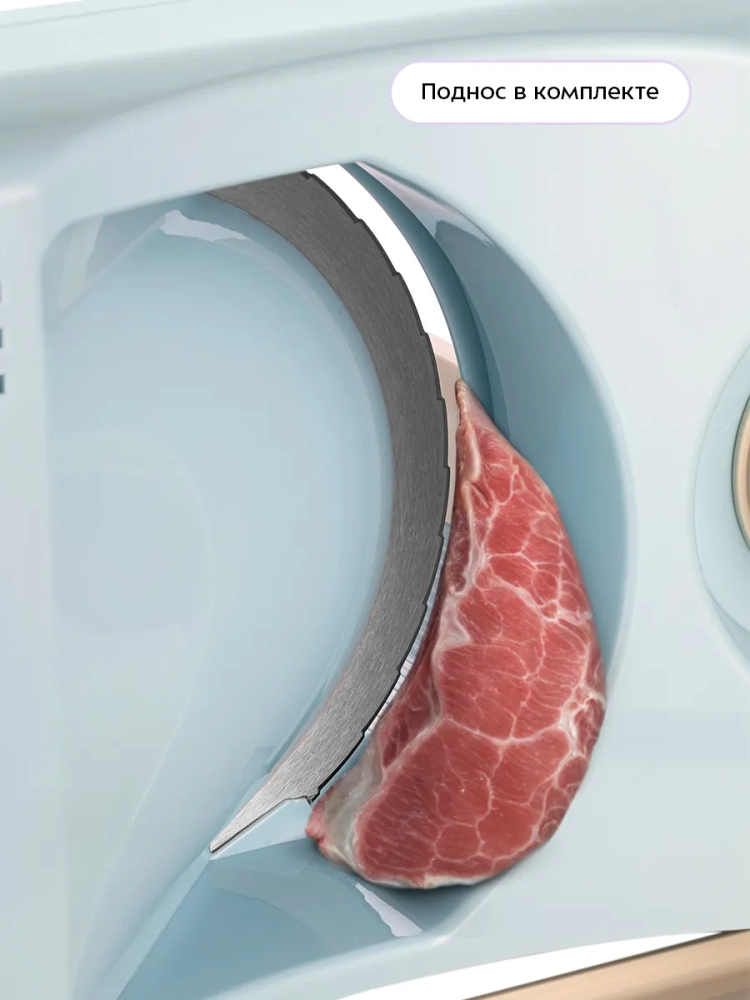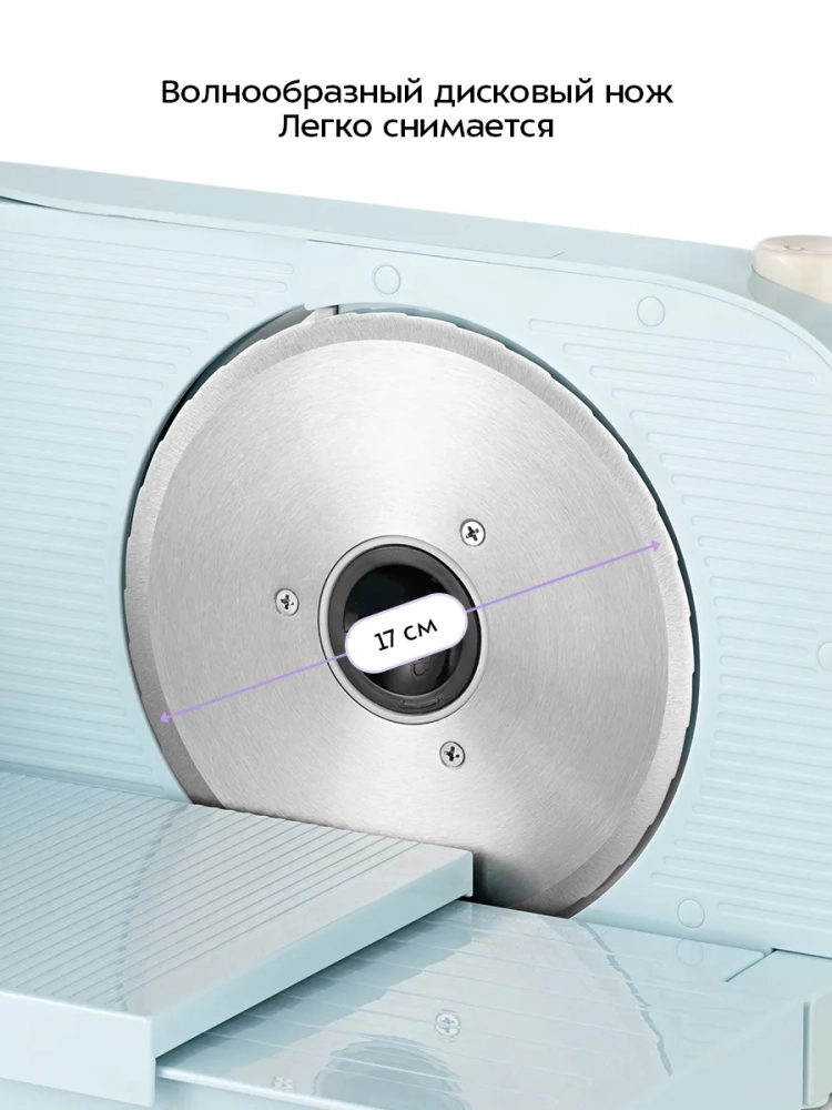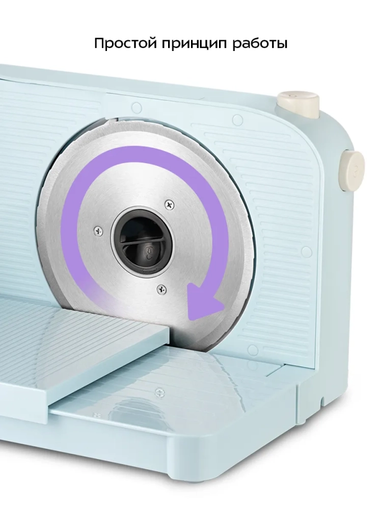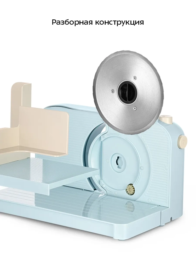 Дисковый нож легко снять для заточки или очистки. Части устройства, непосредственно контактирующие с продуктом, съемные, поэтому их удобно мыть, не беспокоясь о том, что вода может попасть в корпус устройства и вывести его из строя.
