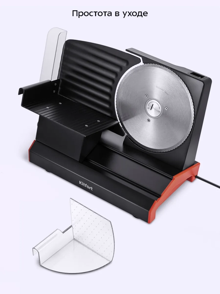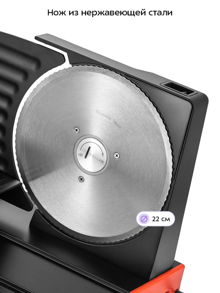 Принцип работы ломтерезки прост: при включении устройства дисковый нож начинает вращаться, и, когда вы пододвигаете каретку с продуктом к ножу, отрезается ломтик необходимой толщины. Нож выполнен из нержавеющей стали и имеет волнообразный край. Толщина нарезки определяется зазором между дисковым ножом и ограничителем. В ломтерезке КТ-9952 толщину ломтиков можно плавно регулировать от 1 до 22 мм. Для безопасной работы предусмотрен пластиковый толкатель, который позволяет пододвигать продукт к дисковому ножу.