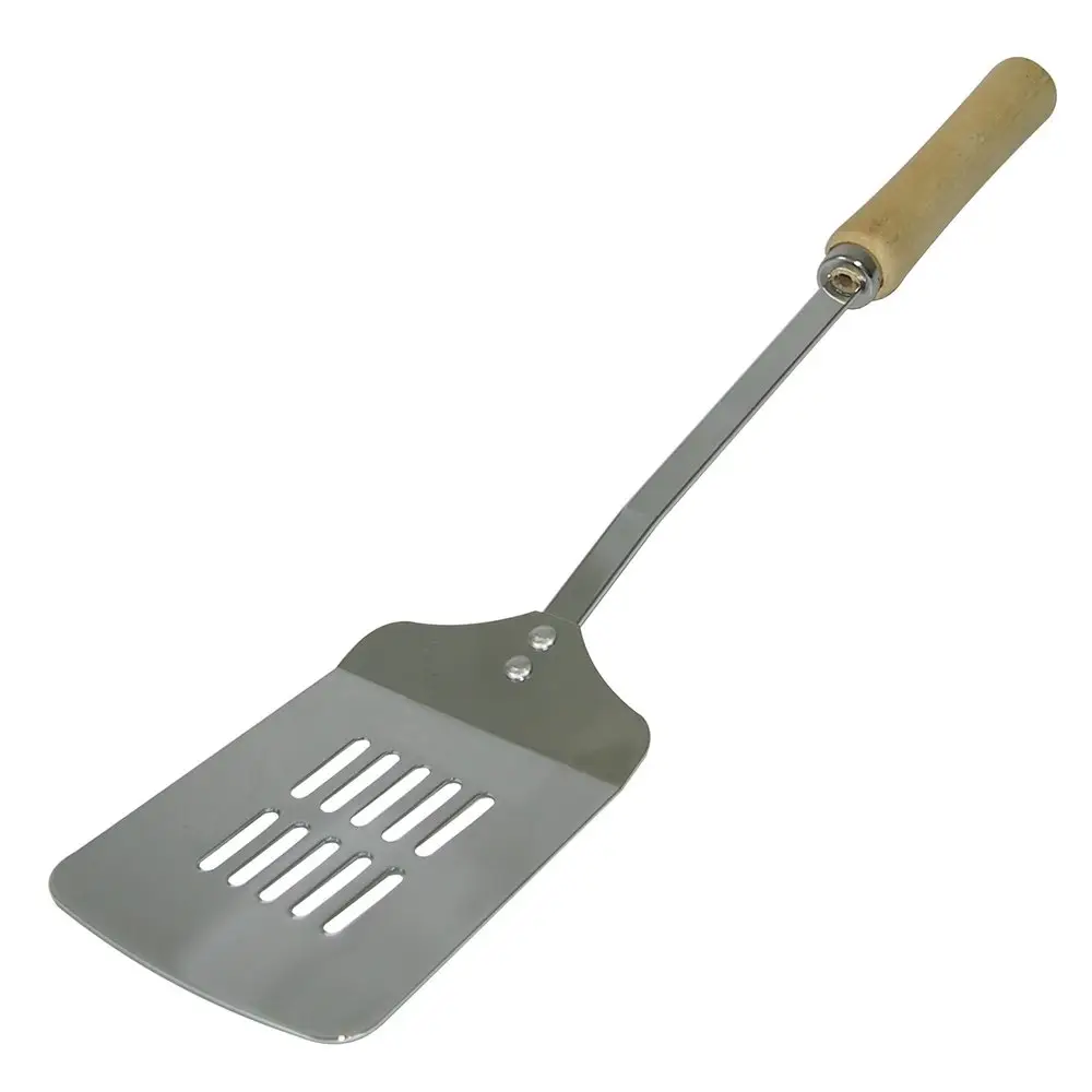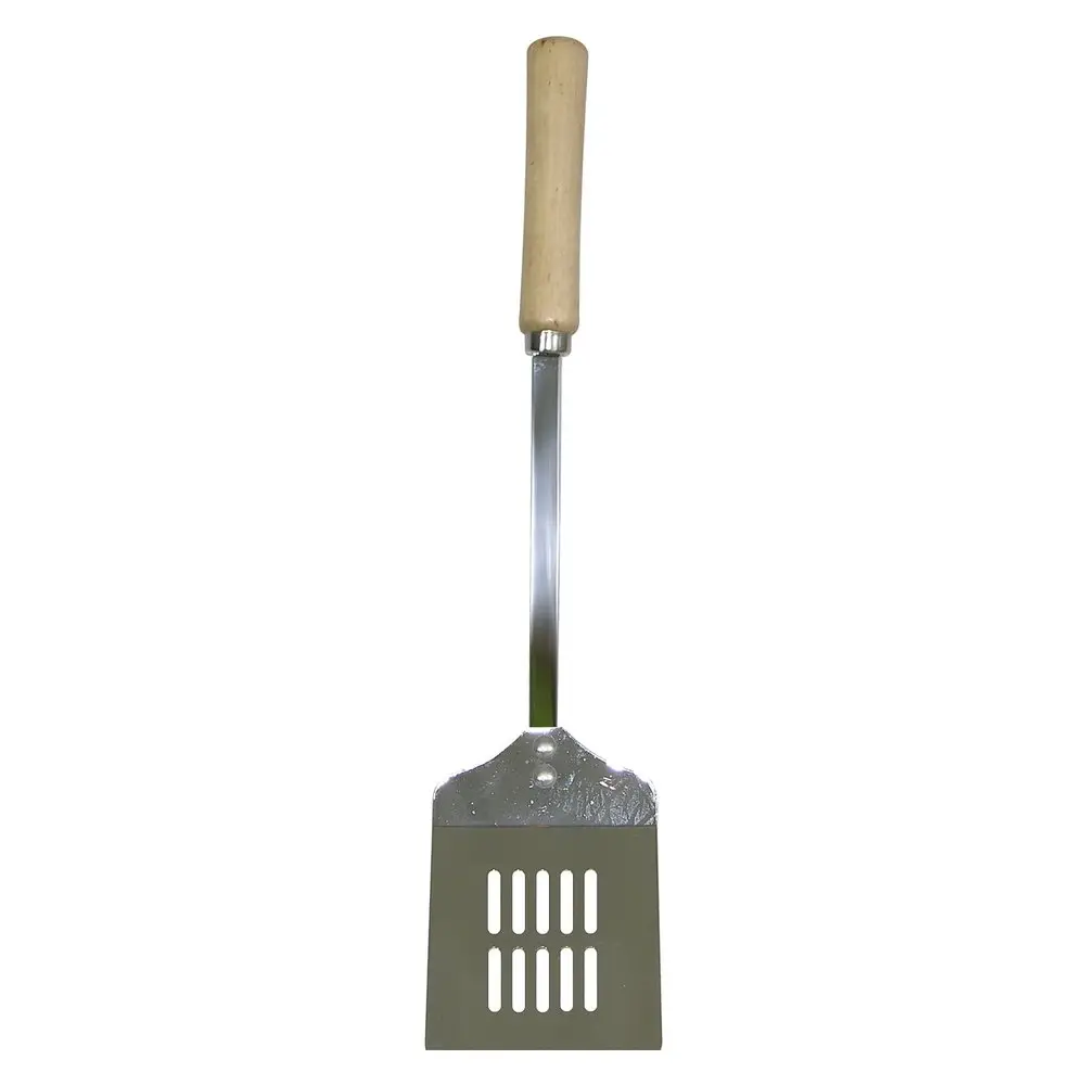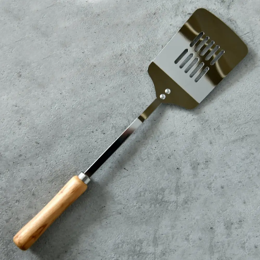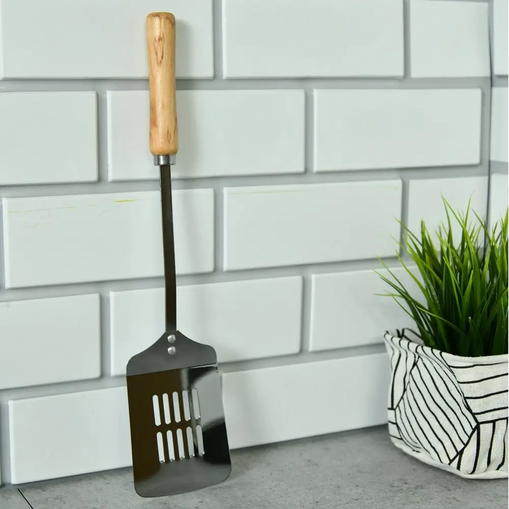 Металлическая лопатка – это прочное и долговечное изделие, которое пригодится в каждом доме. С точки зрения функциональности, металлические лопатки востребованы и не теряют своей популярности. Материал выдерживает высокие температуры, не вступает в реакцию с продуктами. Рабочей частью удобно отскребать пригоревшую пищу. Для сковородок без антипригарного покрытия — идеальный вариант. Лопатка для кухни выполнена их хромированного металла, не ржавеет и не портится со временем. От контакта с горячей поверхностью надежно защитит деревянная ручка. Дизайн подойдет практически к любому кухонному интерьеру. После каждого использования мойте изделие губкой с моющим средством.
