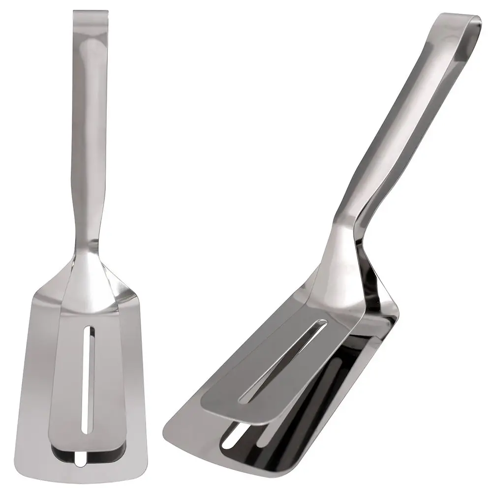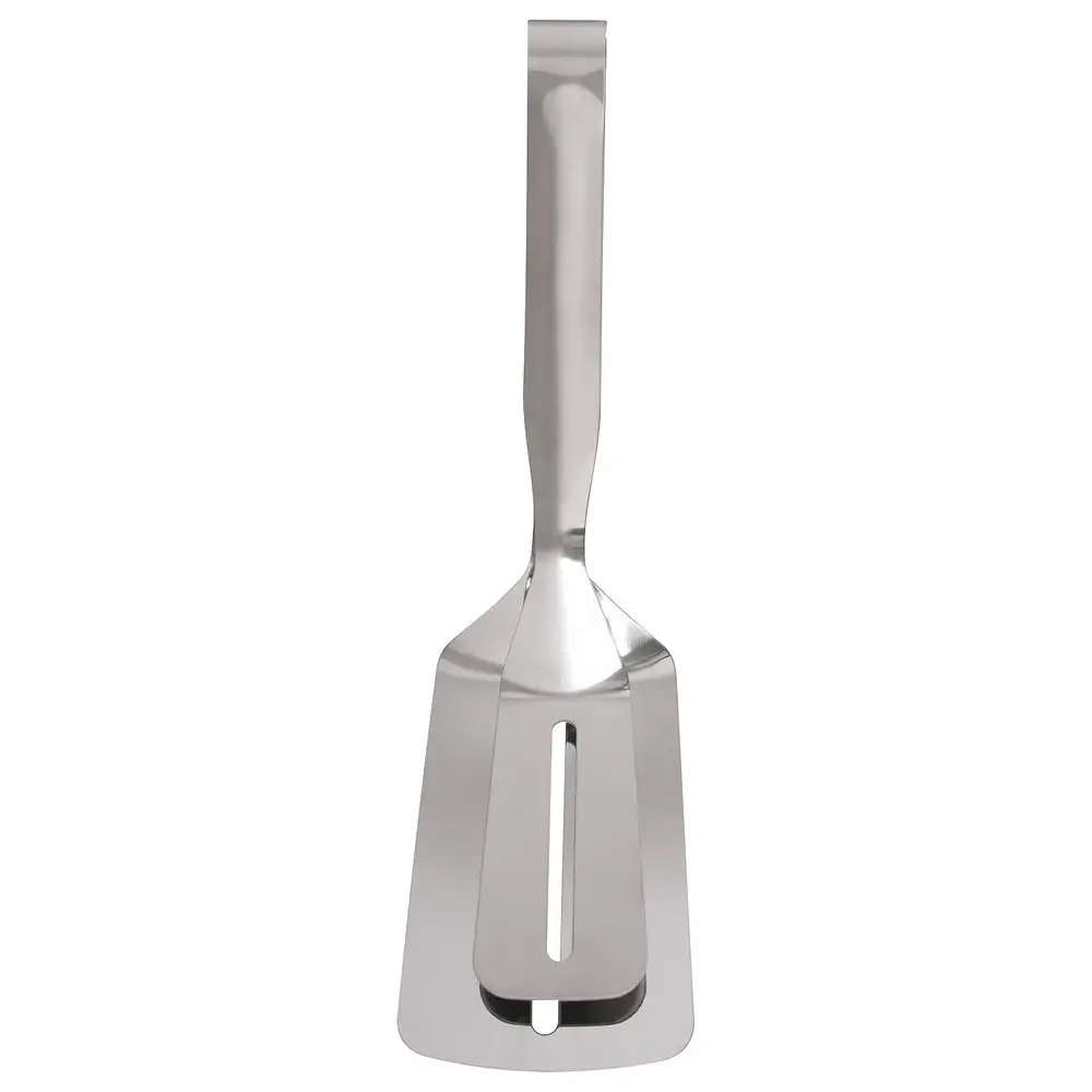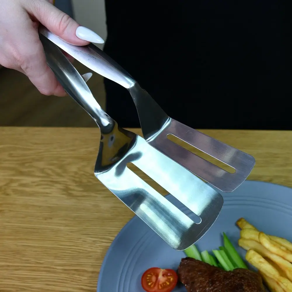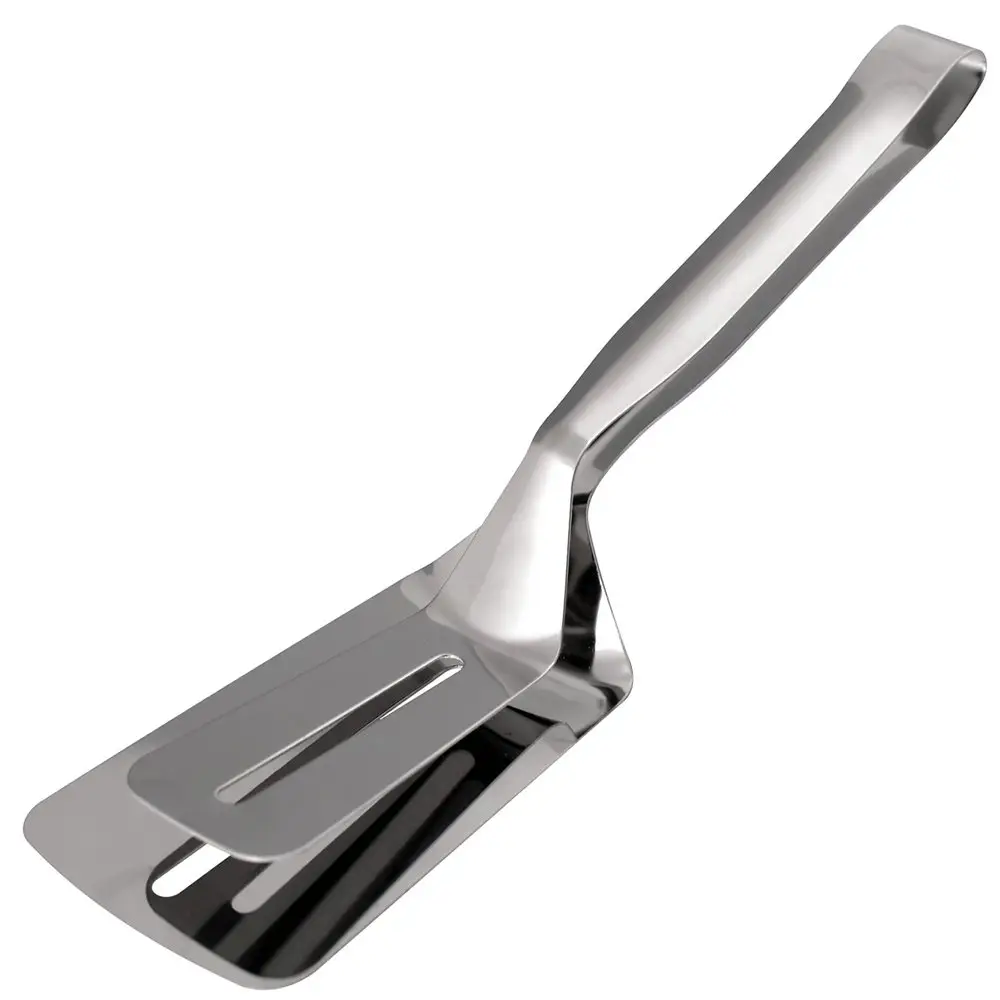 Оригинальная лопатка-щипцы станет идеальным инструментом для жарки различного мяса, котлет, стейков. Также с ее помощью легко снимать с противня печенья, булочки и пирожки. Одна сторона инструмента выполняет роль лопатки, вторая-роль щипцов. Изготовлено: коррозионностойкая (нержавеющая) сталь. Размер 26х7см.