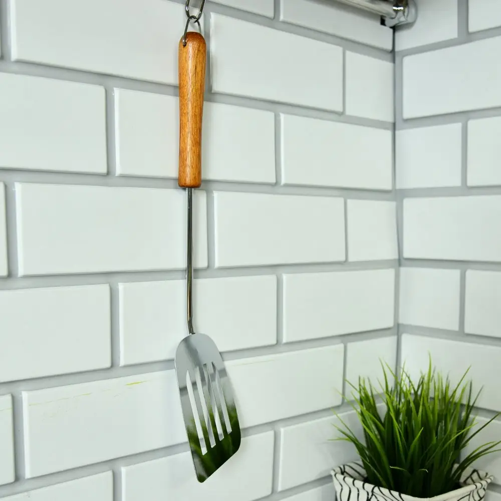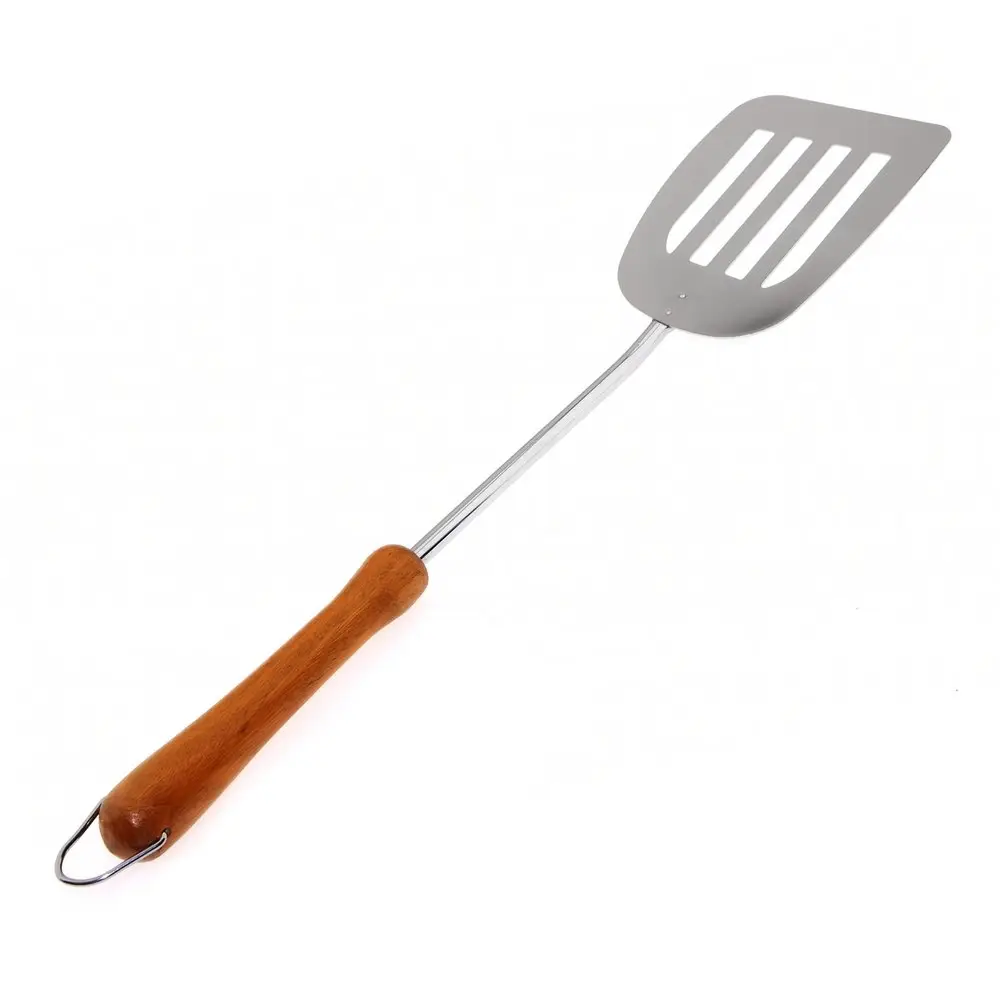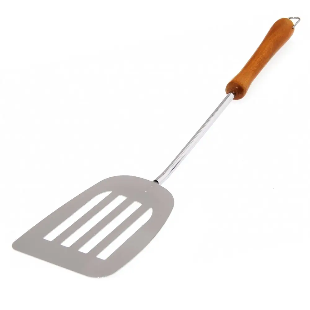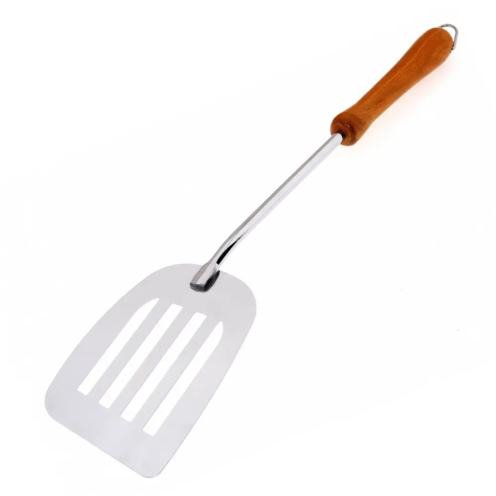 Лопатка для переворачивания пищи — незаменимый кухонный инструмент. Используется не только для переворачивания готовящихся блюд, но и для раскладывания по тарелкам кондитерских изделий. Рабочая часть изготовлена из стали с хромированным покрытием, ручка из дерева.