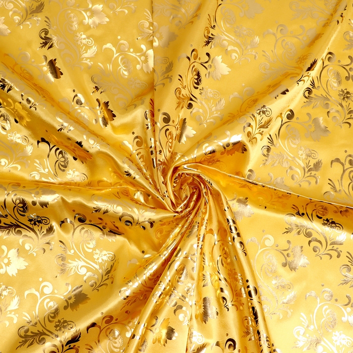 Лоскут атласа бежевого цвета с золотым узором отлично подойдёт для рукоделия и создания уникальных изделий. Этот материал сочетает в себе блеск и элегантность, что позволяет создавать как одежду, так и декоративные элементы, которые будут выделяться.