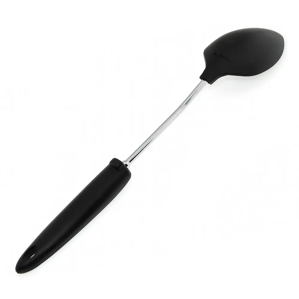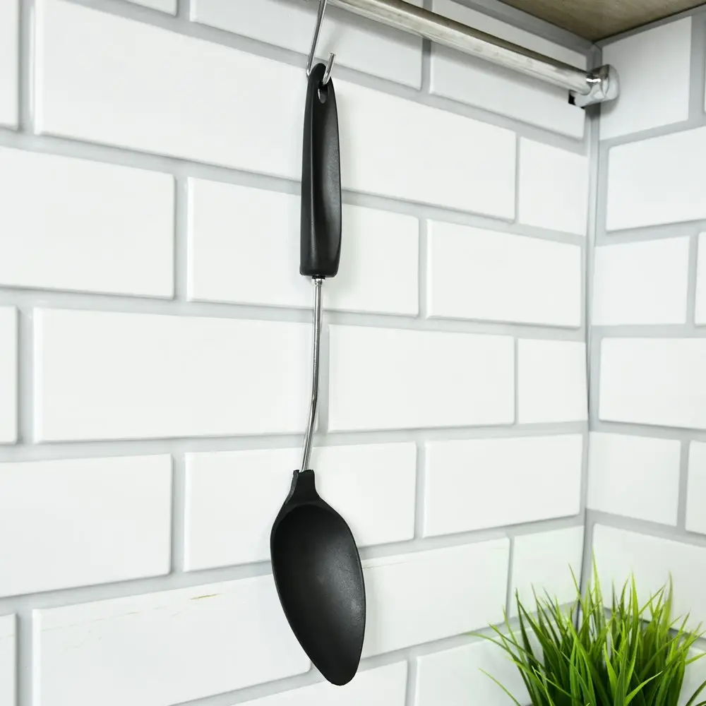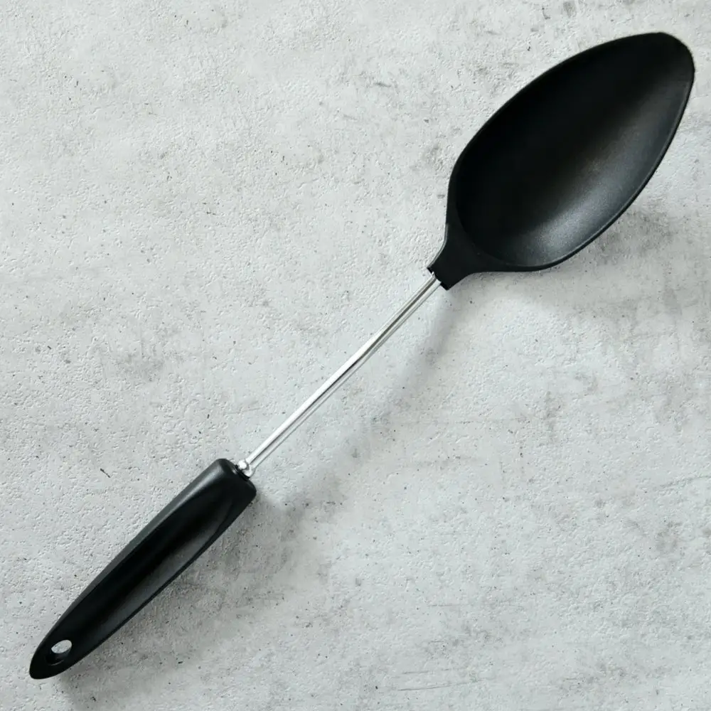 Большая ложка «Софт» активно используется во время готовки супов и горячих блюд. Ей удобно перемешивать супы, овощные смеси, каши, пюре, грибы во время тушения. Рабочая часть изготовлена из пластмассы (нейлон), ручка из хромированной стали и пластмассы. Ложка рассчитана на использование при высоких температурах. После применения вымыть с жидкими моющими средствами.