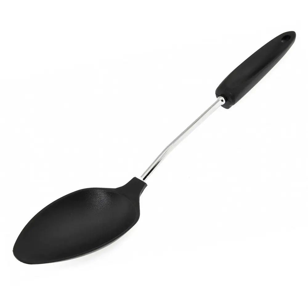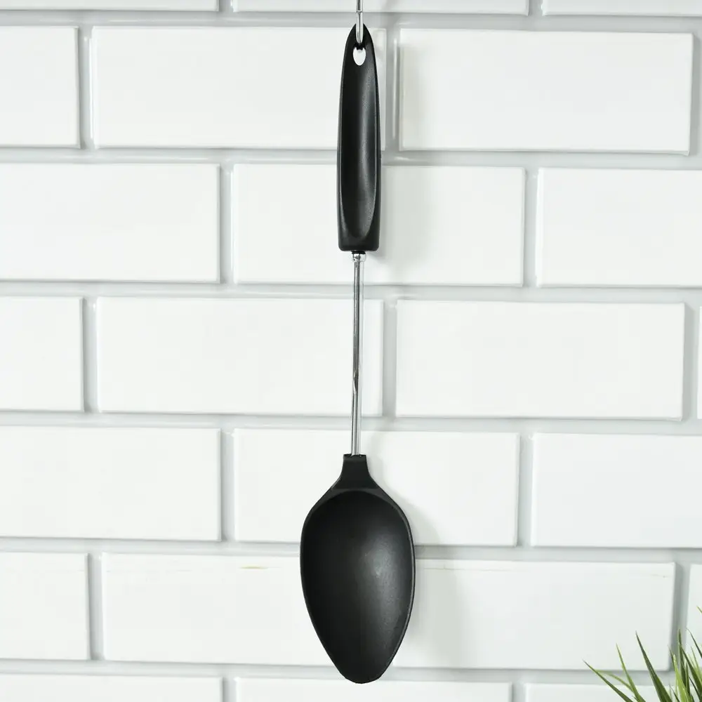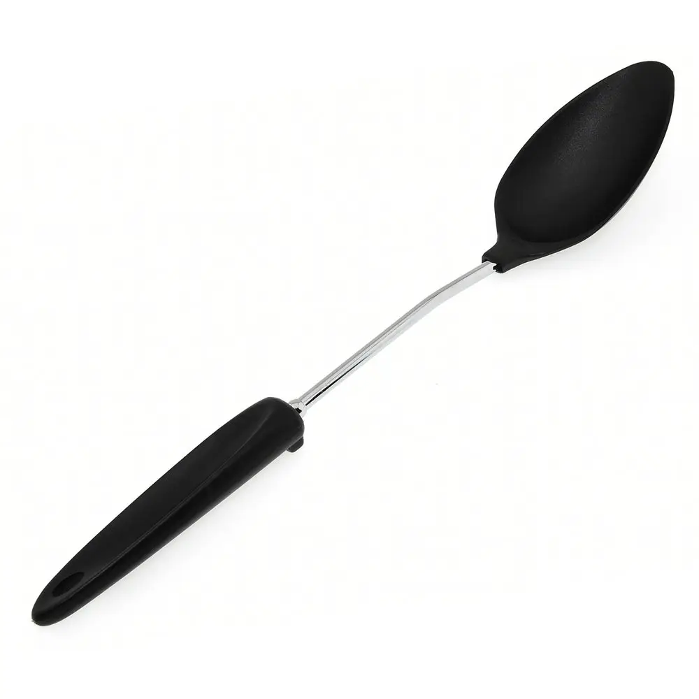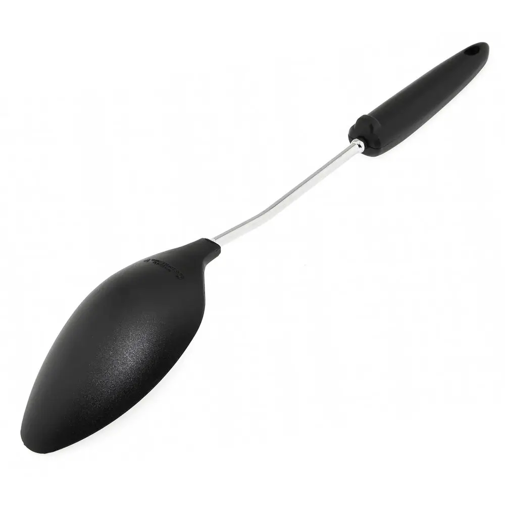 Большая ложка «Софт» активно используется во время готовки супов и горячих блюд. Ей удобно перемешивать супы, овощные смеси, каши, пюре, грибы во время тушения. Рабочая часть изготовлена из пластмассы (нейлон), ручка из хромированной стали и пластмассы. Ложка рассчитана на использование при высоких температурах. После применения вымыть с жидкими моющими средствами.