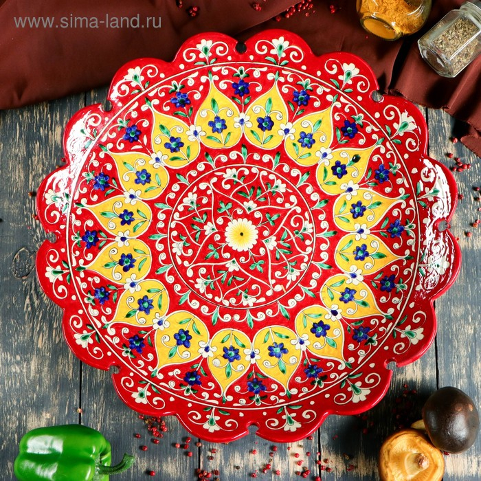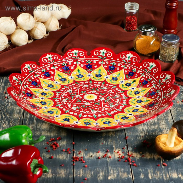 Ляган Риштанская Керамика "Цветы", 42 см, красный, рифлённый