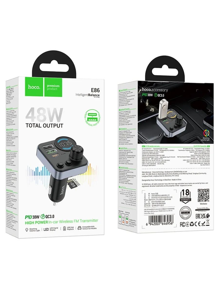 Bluetooth FM-модулятор HOCO E86 — это компактное и функциональное устройство, которое позволяет слушать музыку с USB-накопителей и TF-карт через автомобильную радиосистему.