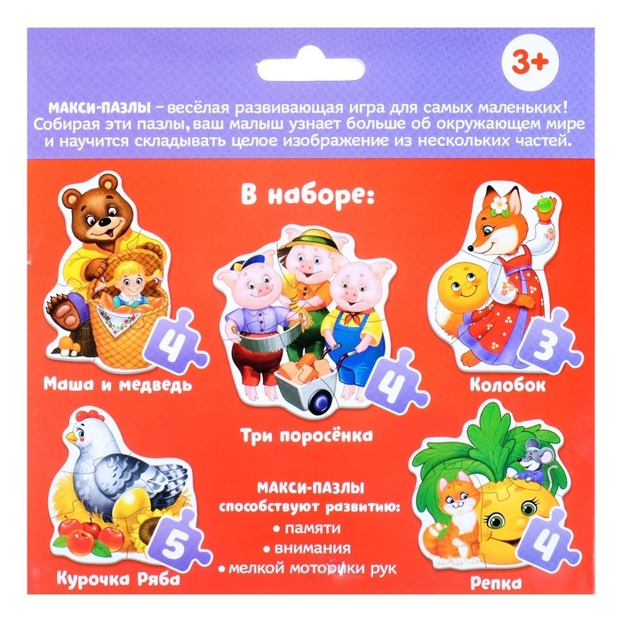 Макси пазлы «Сказки» — это 20 деталей, из которых ребёнок соберёт 5 разных пазлов и познакомится с популярными героями сказок. Макси пазлы помогут развить усидчивость, координацию и мелкую моторику рук, а также научат находить связь между частью и целым.
