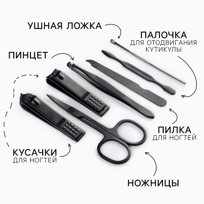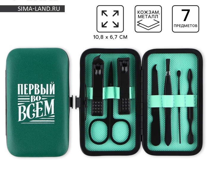 Маникюрный набор 7 предметов «Первый во всем», 10,8 х 6,7 см В набор входит: - маникюрные ножницы; - пинцет; - инструменты для кутикулы; - щипчики; - ушная ложка; - пилка. Размер упаковки (Д × Ш × В, см) 11 х 6,5 х 2 Вес брутто 103 г